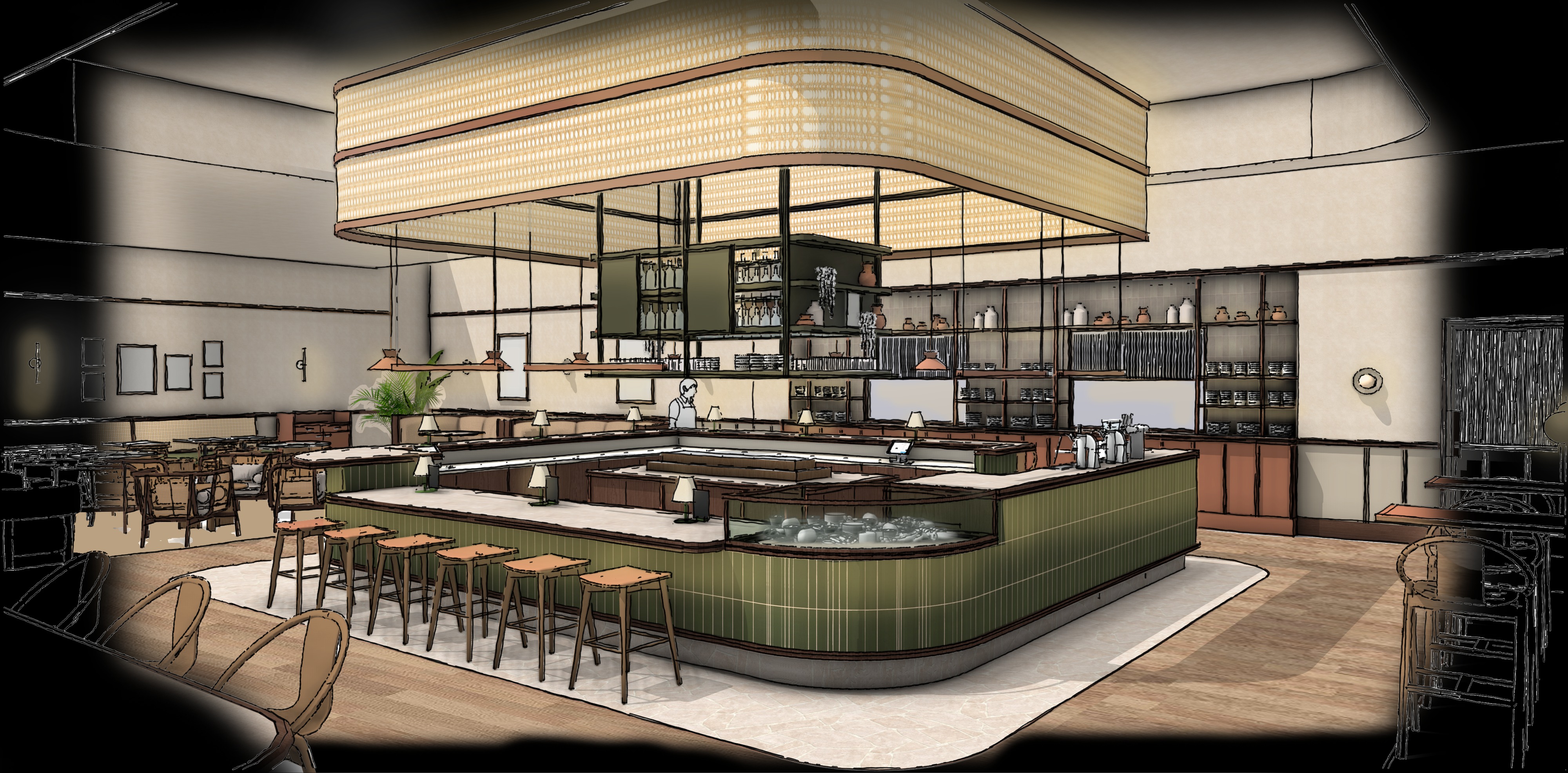 turn this sketch into a photorealistic architectural digest editorial style image with a nighttime setting add people