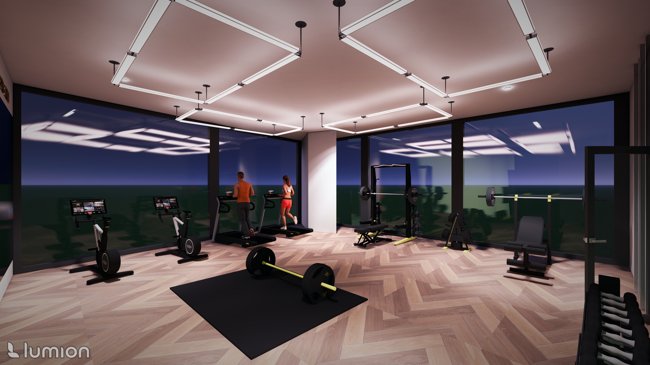 a bright modern luxury gym interior with full height floor to ceiling windows framing a panoramic sydney skyline view including distant high rise towers and a clear blue sky the space features warm herringbone timber flooring and a clean white ceiling fitted with geometric led strip lighting arranged in a grid pattern premium fitness equipment is laid out thoughtfully treadmills with digital screens stationary bikes positioned along the windows a barbell setup on a black workout mat a squat rack weight bench and a full dumbbell rack two people are using the treadmills adding realism and a sense of movement soft daylight floods the room enhancing the minimal contemporary atmosphere and giving the render a refined lumion style finish the overall design emphasises luxury openness and a premium wellness environment overlooking sydney