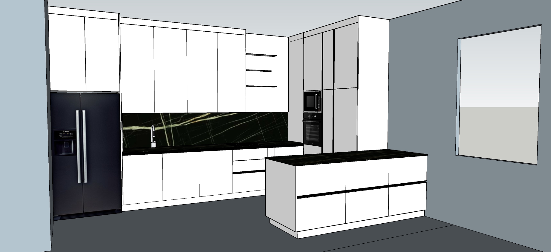 render this kitchen project with finest details doors are white gloss and marble is matte add window efect on the right side and add kitchen elements and things on the counter top add a led under the upper cabinets