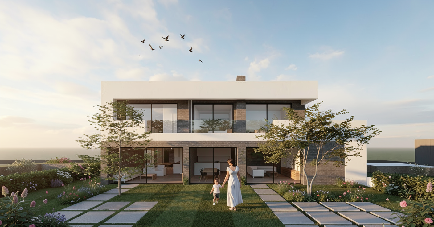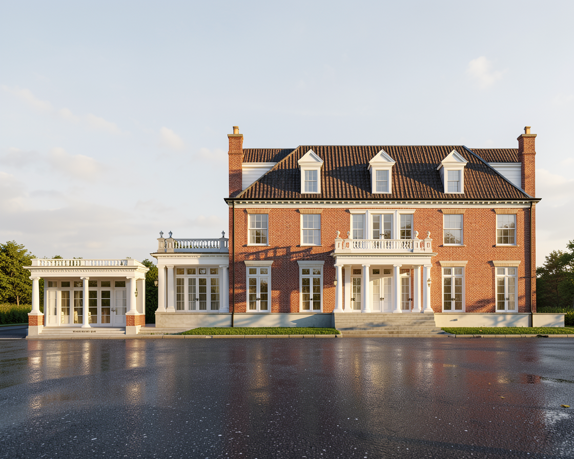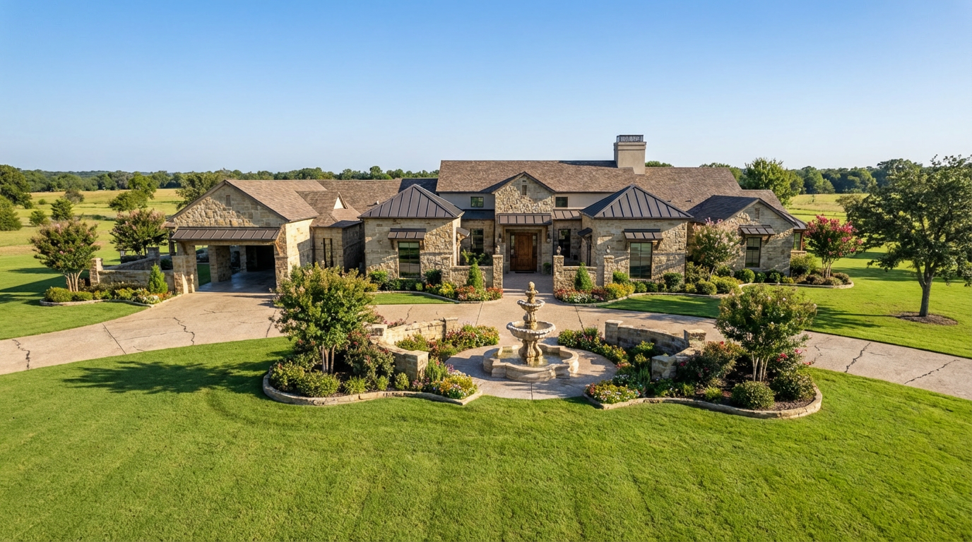 you are a professional image renderer you create the highest grade renderings around and specialize in architectural renderings this is the front elevation of a house create a high resolution photorealistic image of this structure keep the windows as they are where they are keep the doors as they are where they are keep the main structure as it is where it is feel free to change the perspective keep the roofline as it is where is it do not add anything to the structure that i have not asked for the roof is composition shingles architectural style the background will be a pastoral background similar to rural east central texas it should be early afternoon with a bright sunny day clear skies the landscaping should be late summer with plenty of color and should be that of a luxury estate this is multi million dollar home in a very high end development think mar a lago add a fountain and other regal landscaping