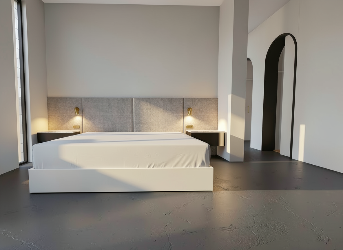 location is pacific palisades california late afternoon sunlight lighting in the space add grass in the yard outside add trees in the adjacent yards outside add a woman sitting on the sofa the glazing mullions are anodized aluminum keep the window at the far end of the source image the glass on the left side of the view is to the outside the purple cylinder at the lower level is an acrylic glass jelly fish aquarium the interior walls are all white plaster add a boy playing with a dog in the yard outside make the jelly fish smaller in size and show more of them make the floor at the lower level below polished concrete