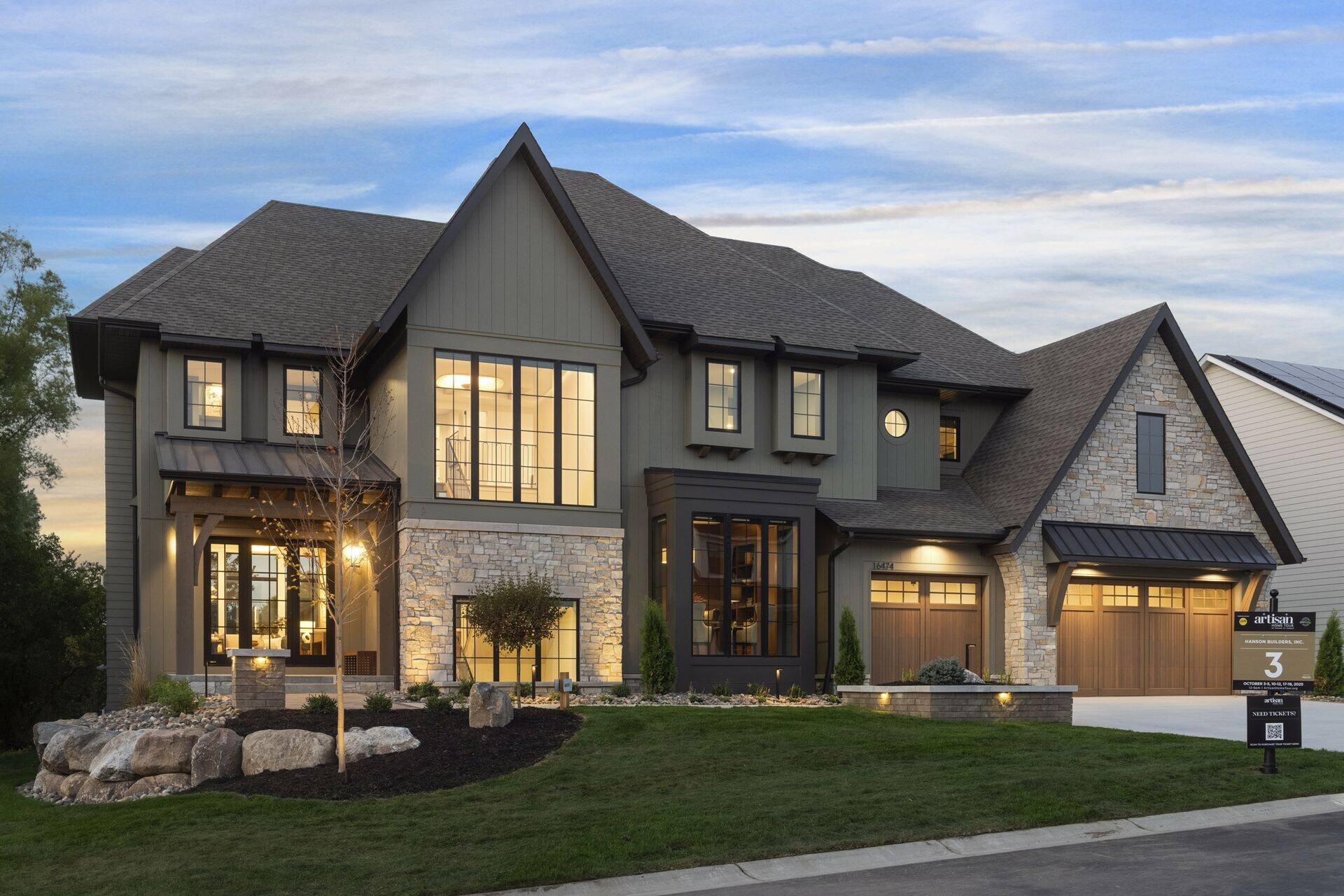 take the original home exterior and recolor it to match the palette of the reference home recolor all siding to a clean white tone with subtle texture convert existing dark gray green siding and stone sections to white painted siding or white brick maintaining realistic material texture change all window frames trim and architectural accents to a deep charcoal black replace warm brown wood elements with medium natural wood similar to the reference home s porch beams darken the entire roof to a consistent charcoal near black architectural shingle maintain the full architectural layout of the original home but extend the garage by one additional stall on the far right matching the style materials roof pitch and detailing of the existing garage bays ensure the new 4th stall is seamlessly integrated into the fa ade and appears original to the design keep overall realism proportions and lighting consistent with the existing image negative prompt do not alter the main massing of the home aside from adding one garage bay do not modify window placement except where required to extend the garage no changes to roofline geometry beyond the garage extension no added porches dormers or decorative elements not present in the original architecture no surreal colors over saturation or painterly effects architecture