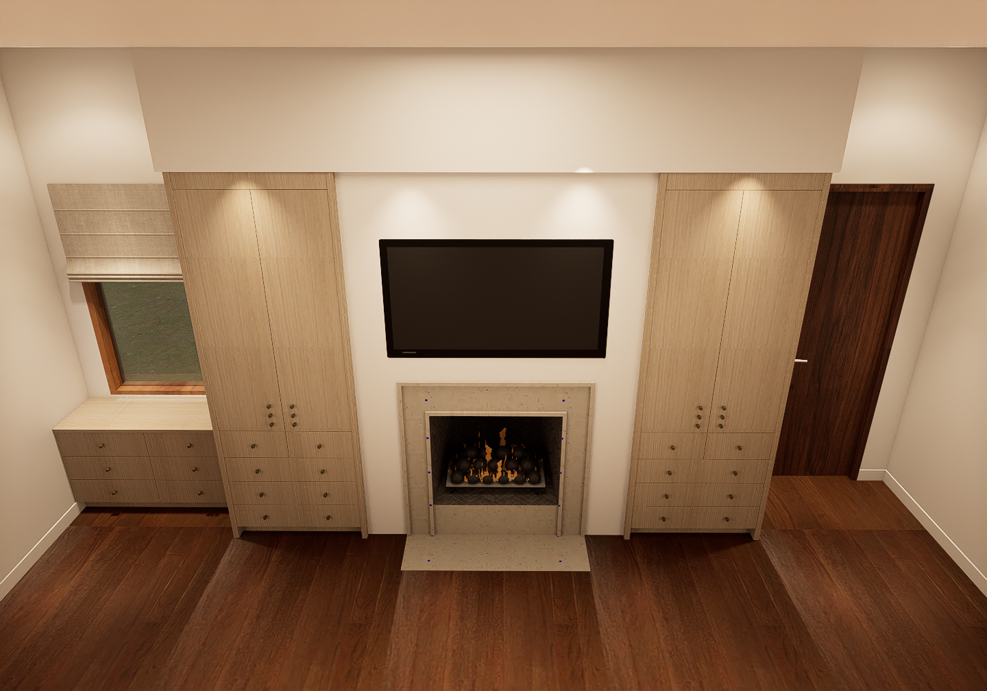ultra realistic interior rendering of a warm contemporary primary bedroom feature wall with a centered fireplace and fully integrated custom millwork composition is perfectly symmetrical with floor to ceiling white oak cabinetry flanking a central plaster fireplace and tv cabinetry is rift sawn white oak in a soft vanilla finish with subtle vertical grain doors are flat panel with minimal brass round hardware lower sections include stacked drawers upper sections are full height storage proportions are clean and modern with tight reveals and precise alignment above the cabinetry a continuous horizontal soffit drop beam spans wall to wall creating a recessed niche for the feature wall and adding architectural depth center section a large flat screen tv is mounted above the fireplace perfectly centered and proportioned fireplace surround is cast concrete warm off white with subtle tonal variation and organic texture hearth and surround are minimal and monolithic firebox interior features a slate grey split herringbone lining with charcoal fire spheres flames are low natural gas soft and ambient left side a built in white oak dresser integrates seamlessly with the cabinetry below are drawers matching the main millwork above a window with a textured roman shade in a warm neutral fabric slightly diffused light passing through right side a flush interior door in a rich walnut tone with vertical grain minimal hardware and a clean modern profile adds contrast to the lighter oak cabinetry flooring wide plank natural hardwood in walnut with visible grain and a soft satin finish planks run horizontally across the space transition detail critical at the base of the cabinetry platform where it meets the wood flooring lighting soft architectural and warm recessed ceiling lights at 2700k with minimal trim gentle wall wash highlighting plaster texture subtle shadowing beneath cabinetry for depth even natural light from window with soft falloff mood style elevated warm minimalism architectural digest aesthetic highly realistic materials with micro texture slight imperfections natural color variation and accurate light bounce no overly perfect surfaces 35 50mm lens perfect symmetry and alignment rendering ultra realistic ray traced lighting global illumination soft shadows physically accurate reflections high material fidelity fine surface detail