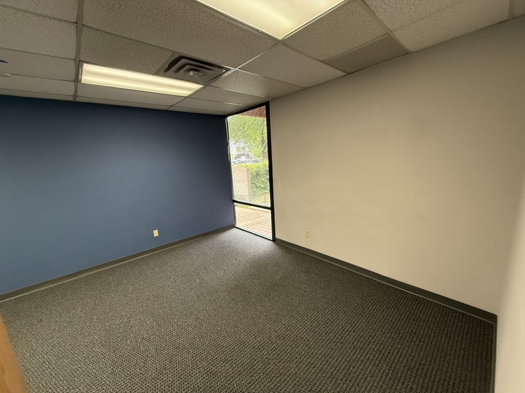 an exectutive office for an eclectic it security professional l shaped or wrap around desk where the back of the desk is pointing towards the blue wall also a 1 or 2 guest chair set up