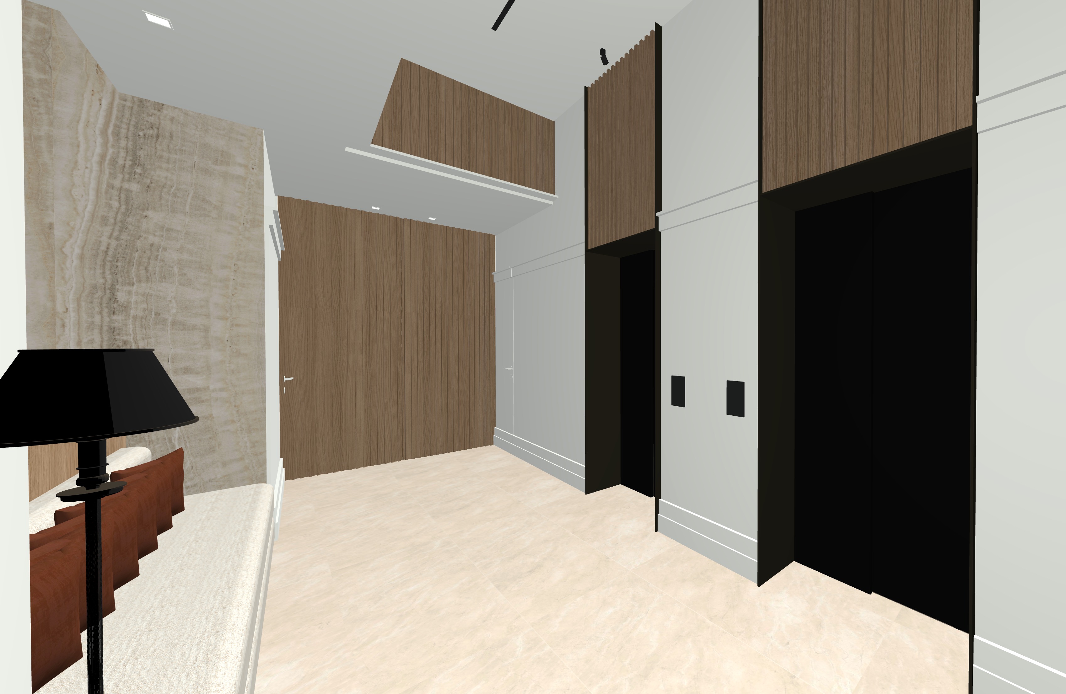legno rovere leggermente sbiancato le ante degli ascensori sono in vetro nero