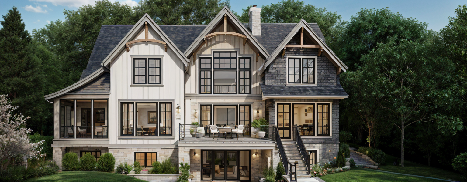 exterior shot a beautiful modern three story house with a picturesque tranquil atmosphere the house features dark gray shingles grey hardie board siding with white trim with expansive black framed windows that reflect a soft warm glow the roof is steep and beautifully symmetrical with charming gables surrounding the house are lush green trees providing an inviting natural backdrop the ground is covered in well manicured rich green grass the front features an elegant staircase and a variety of vibrant plants including white flowering shrubs and bright green foliage the sky is a clear blue with clouds creating a peaceful serene setting