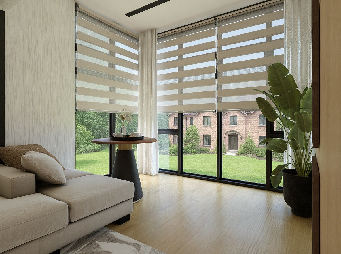 maintain details add trees landscape on window at left side maintain blinds and curtain remove light speckles