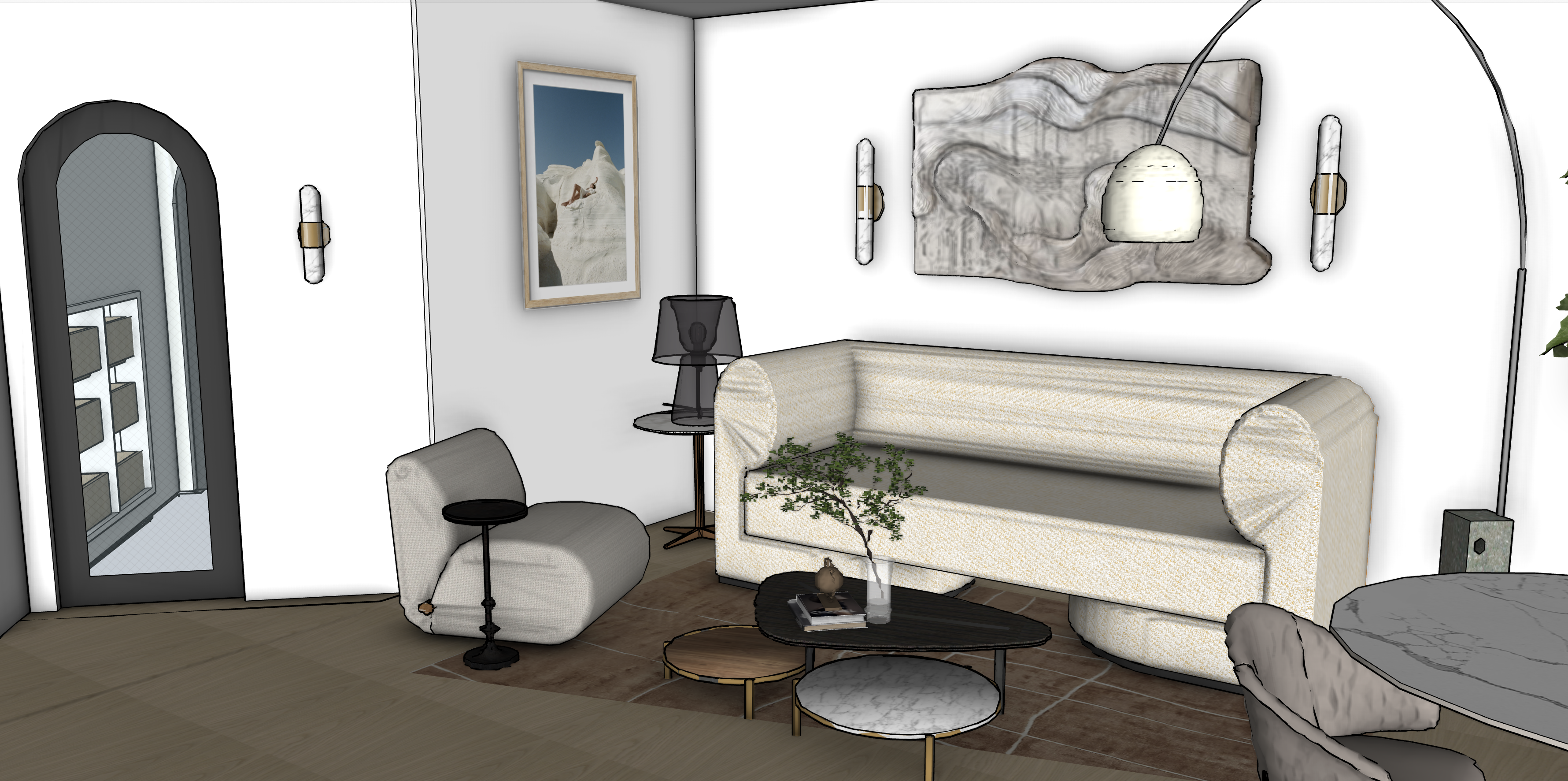 keep colors the same make photorealistcm turn on 3 wall sconces and floor lamp add recessed lights