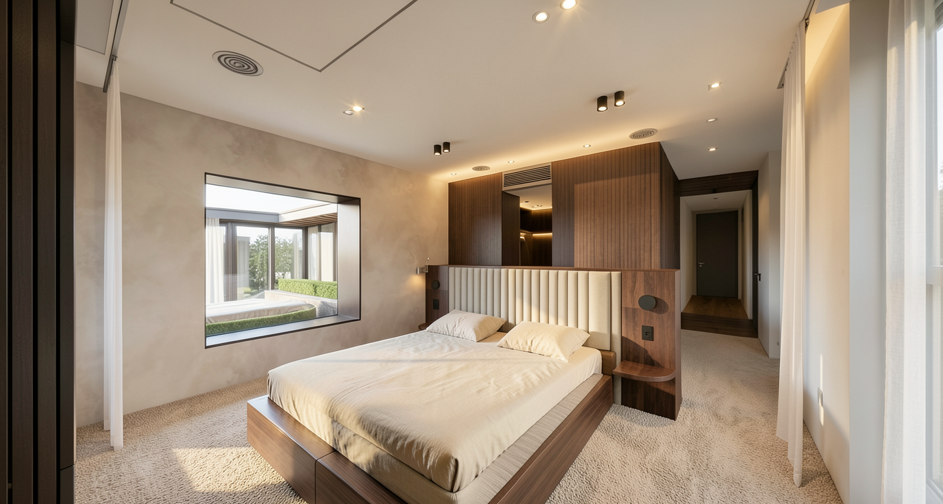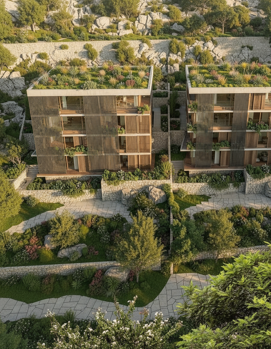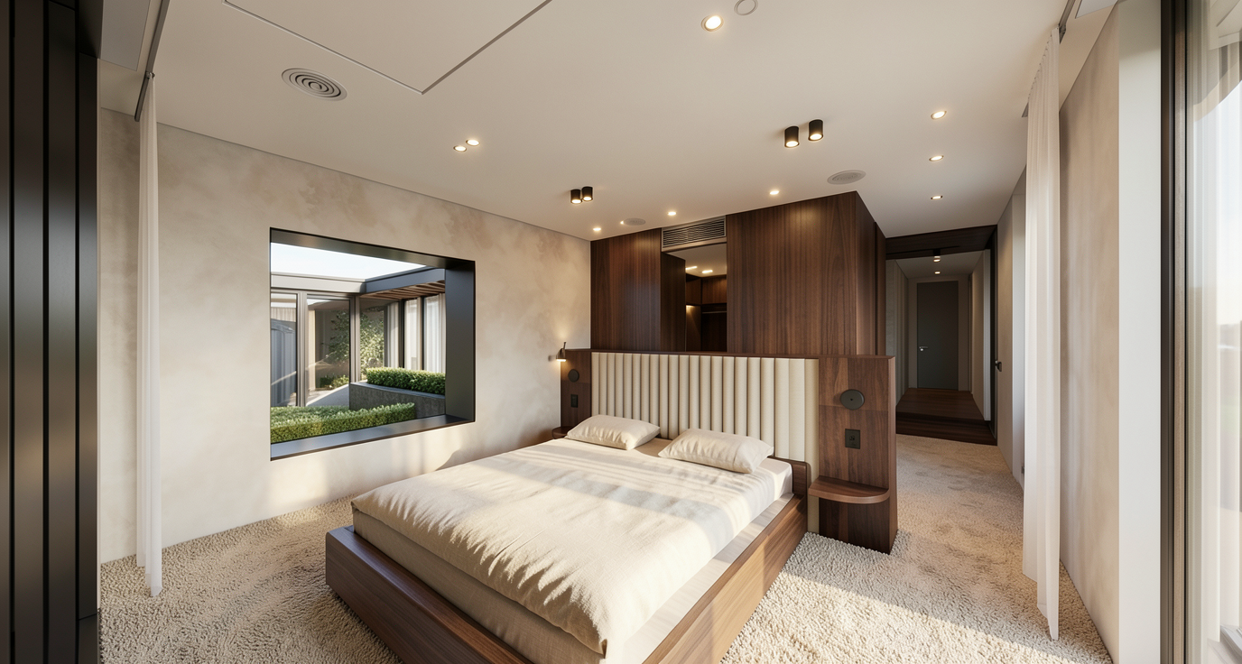create a photorealistic render do not change camera position and angle respect the prpoprtion and geometry create a soft and neutral warm light and contrast between lighter areas and darker areas