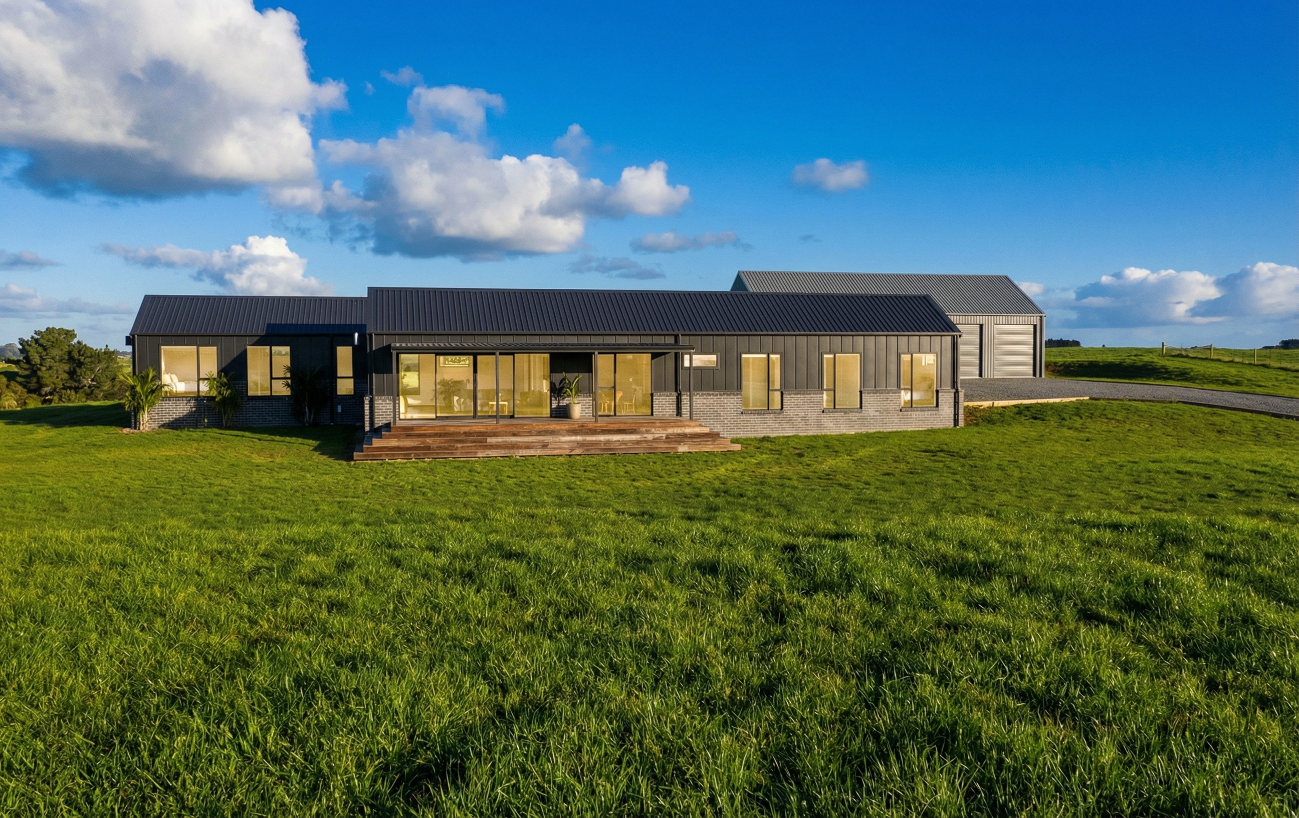 a manicured lawn lots of australian eucalyptus trees in the background and the foreground australian native ferns and plants garden beds low maintenance native shrubs native plants stone pathway leading to the entrance an outdoor kitchen entertaining area to the left front with a skillion roof and a pathway to a firepit children playing