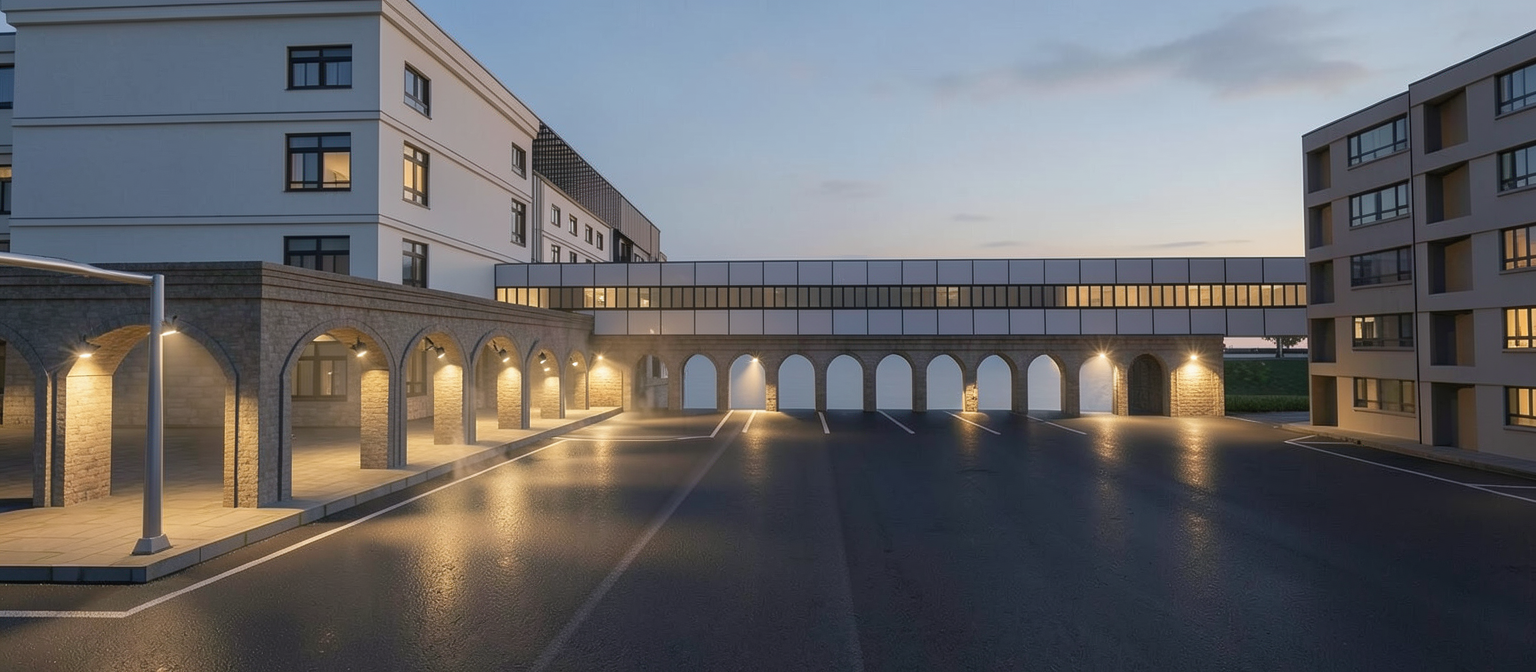add people and village walkway between buildings