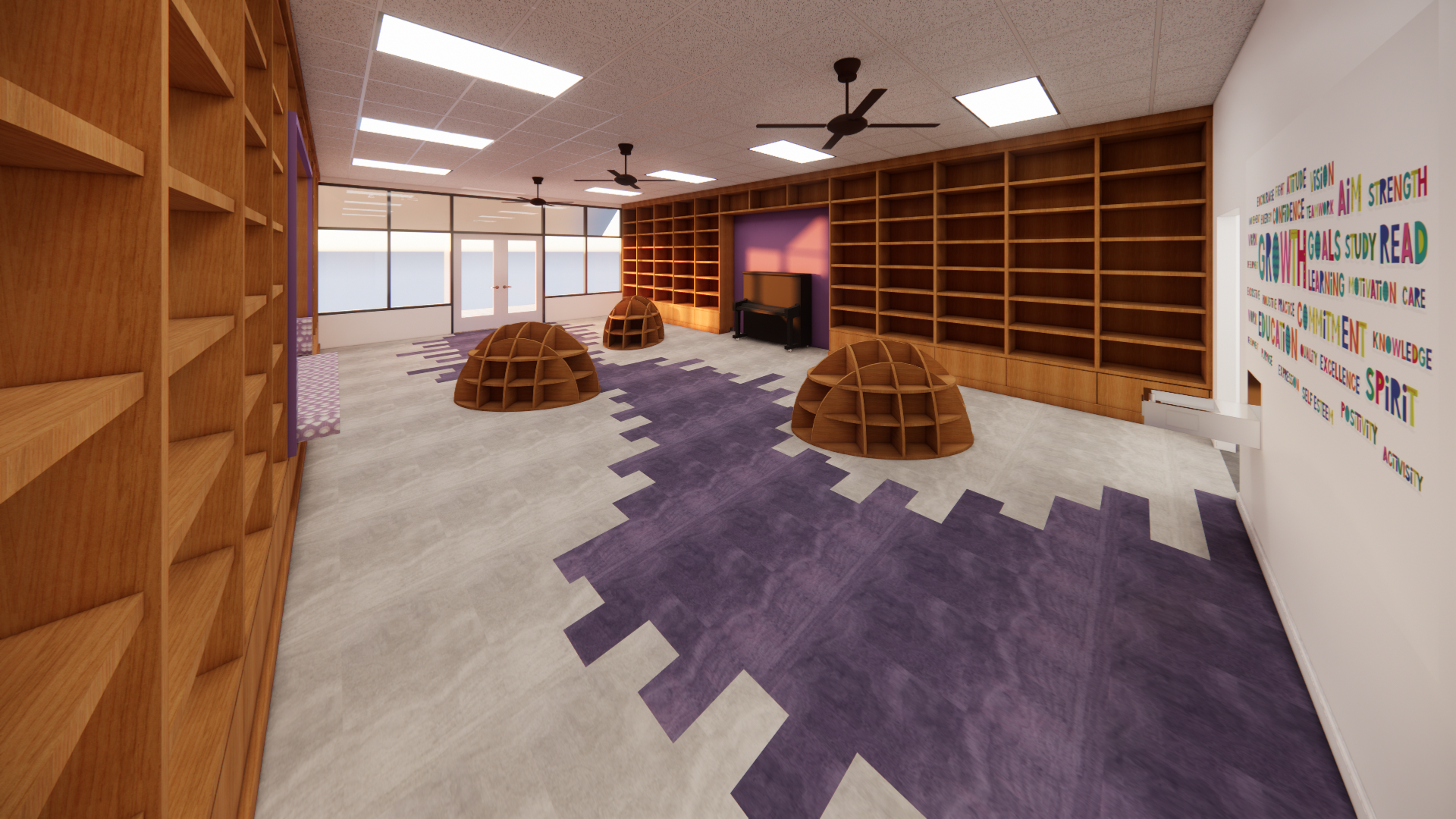 improve this interior rendering of a children s library by adding children s books to the wall mounted shelving and the freestanding wooden bookcases along the floor that are there books should be colorful age appropriate and varied in size with some stacked vertically and others horizontally for a natural lived in look add a diverse range of children and adults using the space including different ages ethnicities and abilities maintain the existing architectural design materials lighting and furniture layout do not alter wall colors flooring shelving or ceiling elements or add any furniture