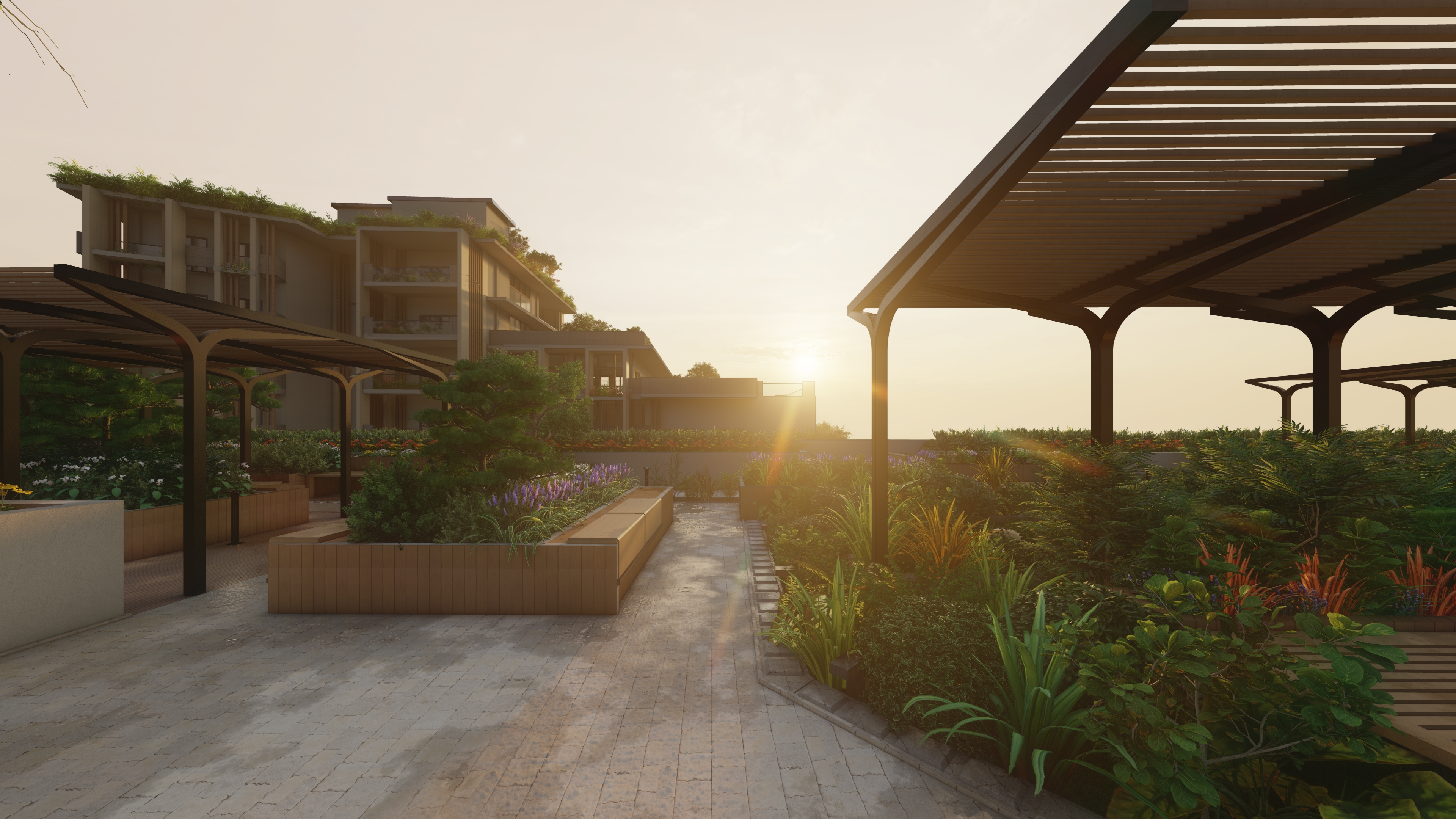 modernist exterior shot modernist exterior shot sunset lighting modern contemporary materials in warm gray tones wood slats in the facade cinematic photorealistic 4k resolution 16mm camera lens san mateo rizal valley surrounding greens skyline of metro manila do not alter the design of the building architecture architecture