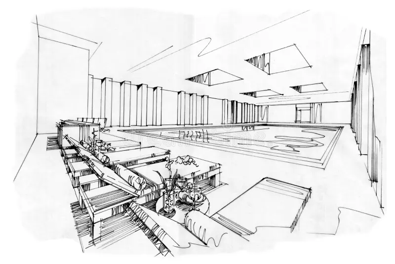 interior shot render a luxurious indoor swimming pool area with modern design the spacious room features large skylights that allow natural sunlight to flood in casting gentle reflections on the water s surface the walls are adorned with sleek light gray panels providing an elegant backdrop the pool water is a serene cyan blue creating a calming atmosphere comfortable lounge chairs with plush white cushions line the sides while potted plants with lush green leaves add a touch of nature the floor is a smooth polished beige marble adding to the sophisticated ambiance the overall atmosphere is peaceful and opulent perfect for relaxation and leisure architecture