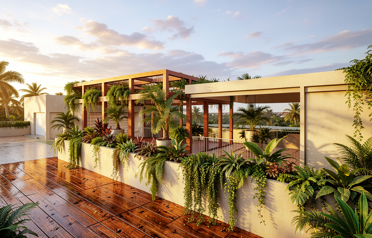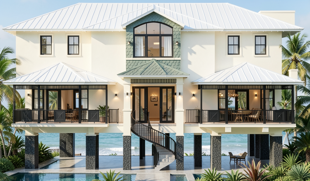 need to render this elevation make house creamy white with black framed windows and doors no mullions make roof white metal and add accent color or green grey have the landscaping be tropical with an ocean view from back of house make railings black and elevated columns under house to be black pebble there is an arched window in center third floor with fishscale tile in point of roof make that fish scale siding the grey greenish color make the exterior lighting larger more modern on the first floor this is open out to the ocean and pool area it is a stilted elevated coastal home make all the roof standing seam metal in a beige color