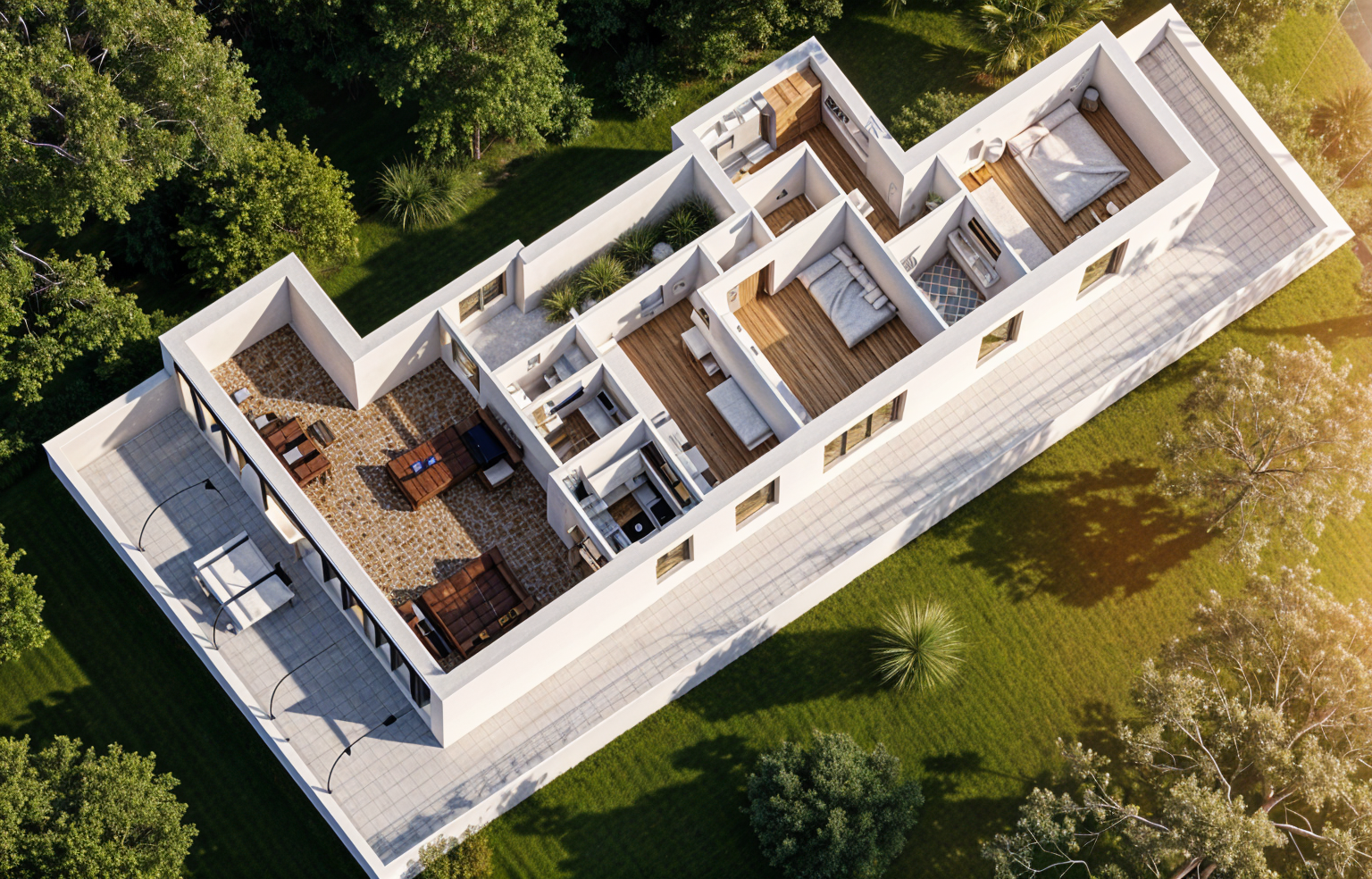 realistic image with dusk sky interior lights turned on realistic pool water potted plants in corners add towels on chaise lounges make windows doors roof rafters and railings white remove upper balcony and railing remove upper railing at balcony remove beams in gable roof make walls white washed brick remove rafter tails remove upper balcony