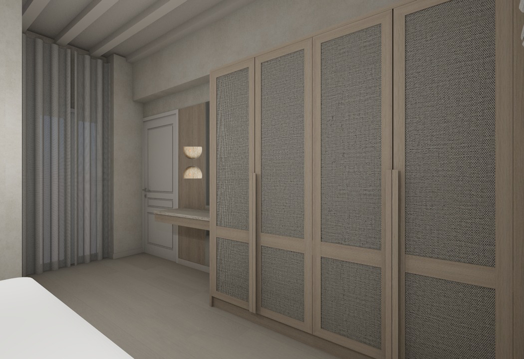 the wall sconces are flat semicircle wall lights made of travertine stone shaped like a half moon attached to the wall with soft indirect light shining upward create a realistic and professional render of a bedroom with a calm and atmospheric mood the space is softly illuminated with natural daylight creating a gentle ambiance with minimal shadows the lighting should feel balanced and natural enhancing the realism of the materials without strong contrasts