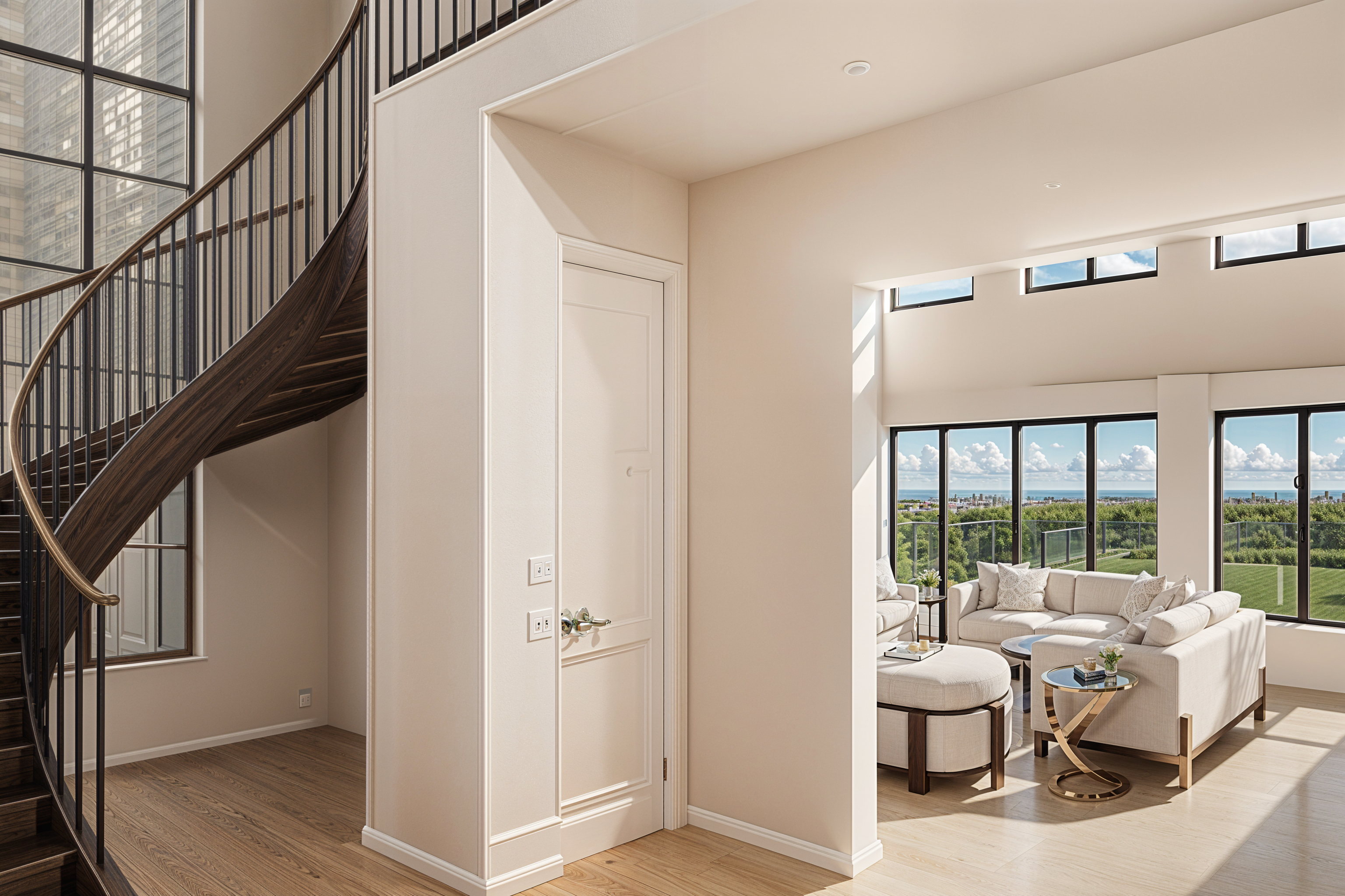 a beautifully rendered architectural interior with large arched windows and a modern spiral staircase the atmosphere is light and airy with natural daylight streaming in the walls are soft beige complementing the bright clear blue sky outside the staircase features dark wood steps and a sleek matte black railing providing a sophisticated contrast outside the windows a lush green lawn is visible enhancing the serene and inviting ambiance of the space