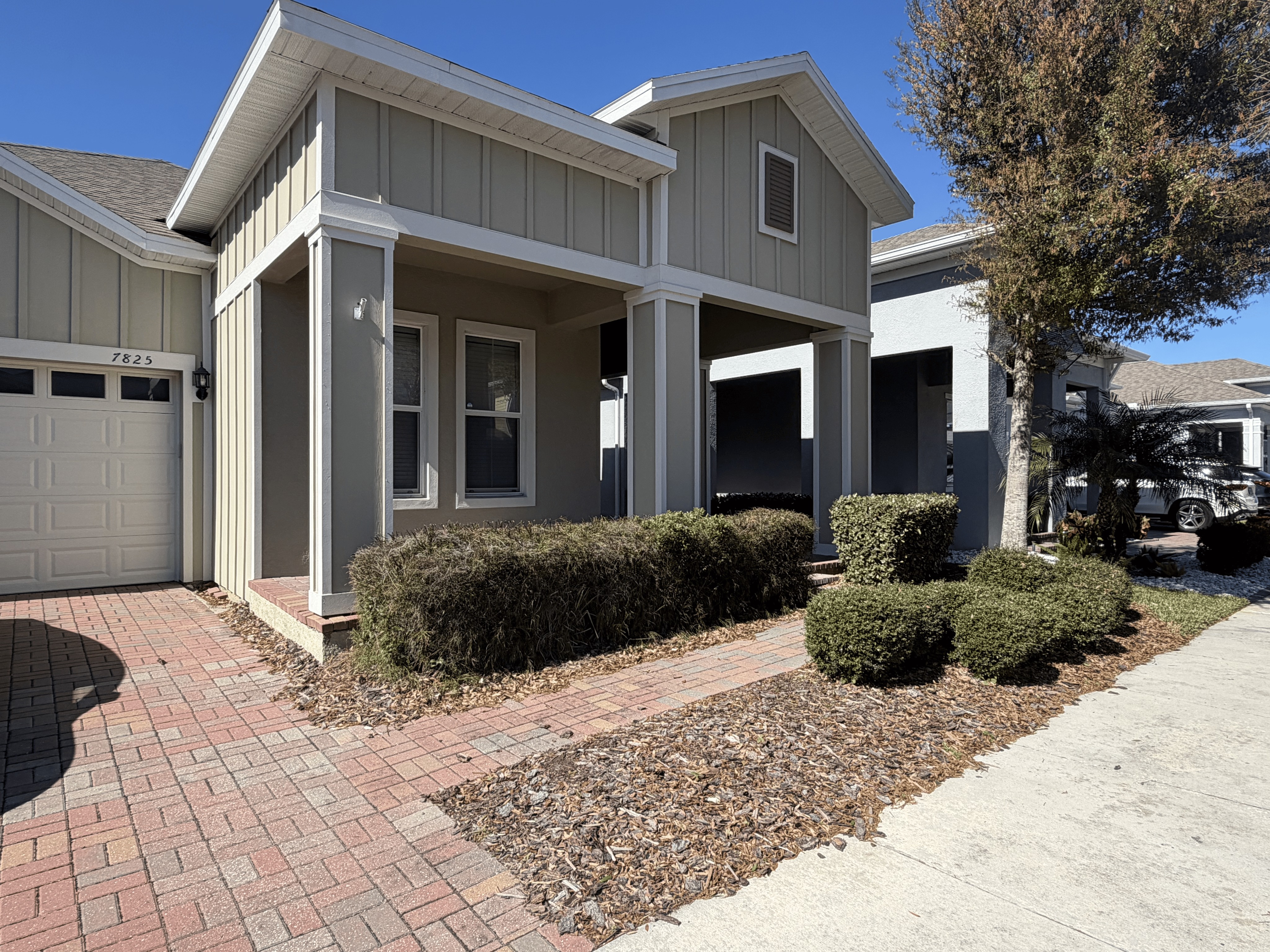 add nice low maintance landscape to existing mulch flower beds on front and side of the existing porch using shrubs and mainly greens no flowers replace the exiting mulch to white marble chips keep the existing pavers path and existing landscape