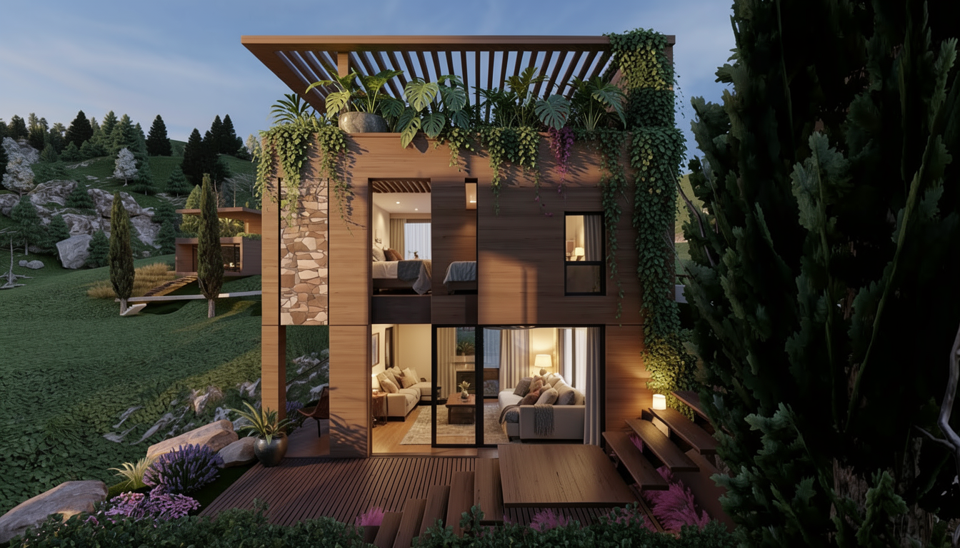 refine the background wall using hainan huanghuali wood with a smaller and more realistic wood grain scale reduce the saturation and match the tone to the staircase wood for a harmonious material identity integrate subtle vertical luminous panels within the wall composition the lighting should softly reveal abstract li brocade patterns embedded into the surface not applied as decoration but integrated into the architecture keep the overall design elegant refined and culturally sophisticated