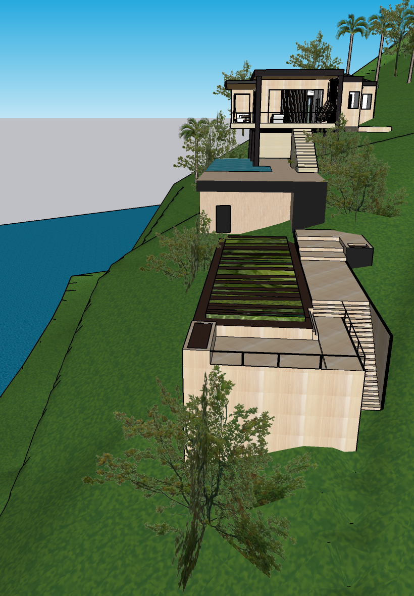 exterior shot render a modern hillside house with terraces overlooking a serene blue ocean use warm beige and light brown tones for the house exterior with sleek black accents on railings and frames render lush green grass and lively palm trees surrounding the building enhancing a tropical vibe add realistic textures to the foliage and structure set against a clear bright azure sky creating a tranquil inviting atmosphere