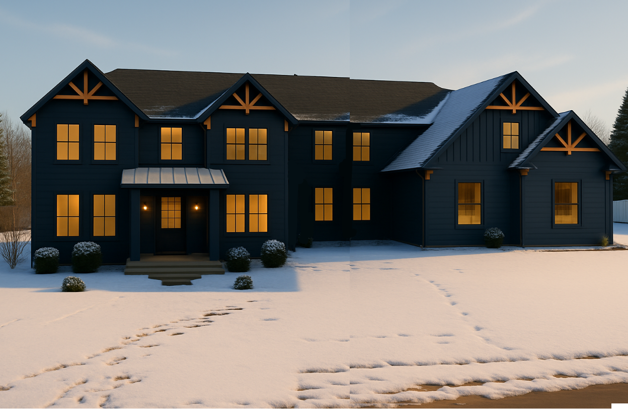 exterior shot the left side of the house will stick out further than the garage to the right dark blue horizontal siding with vertical siding on the peaks and the section to the left and front of the main entrance main entrance door to be a double door appear in the daytime so the house is more visible