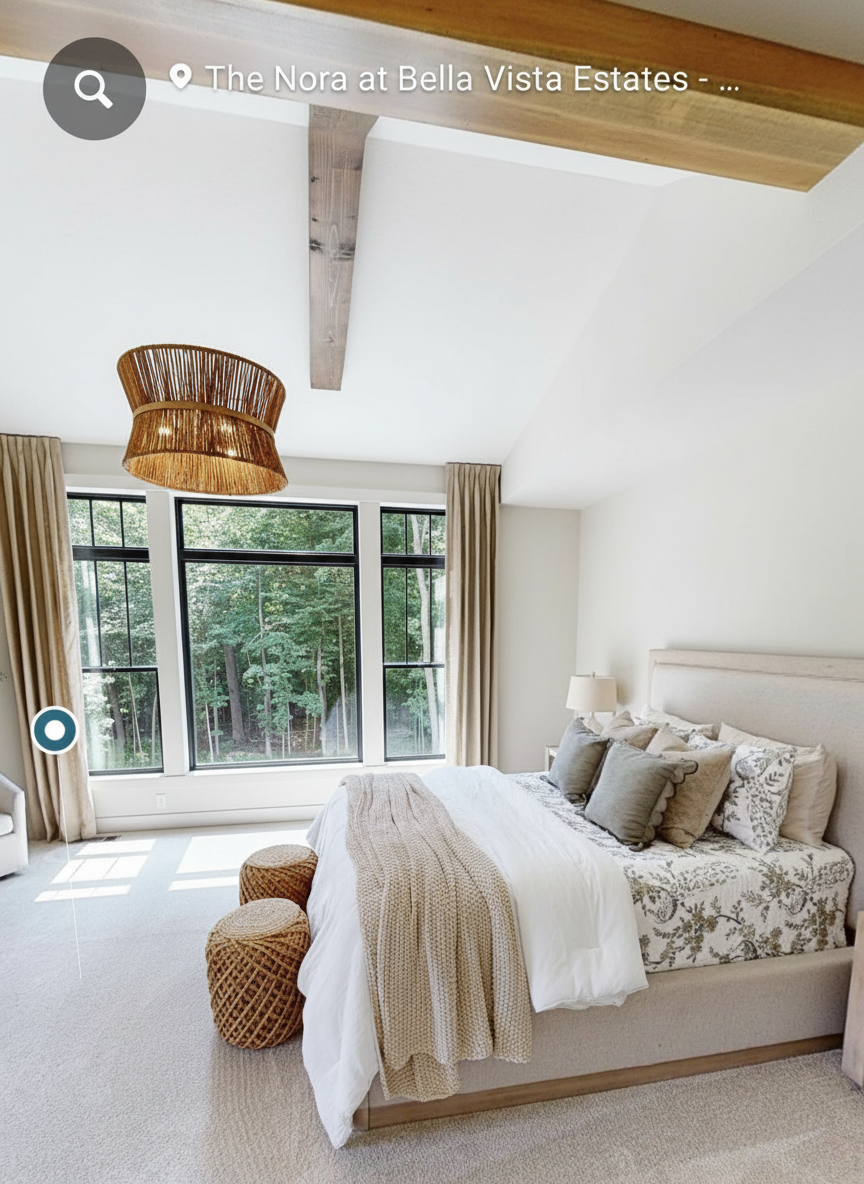 remove the beams change the windows to black change the ceiling to cathedral with a beam down the middle at the peak bedding and curtains should be white