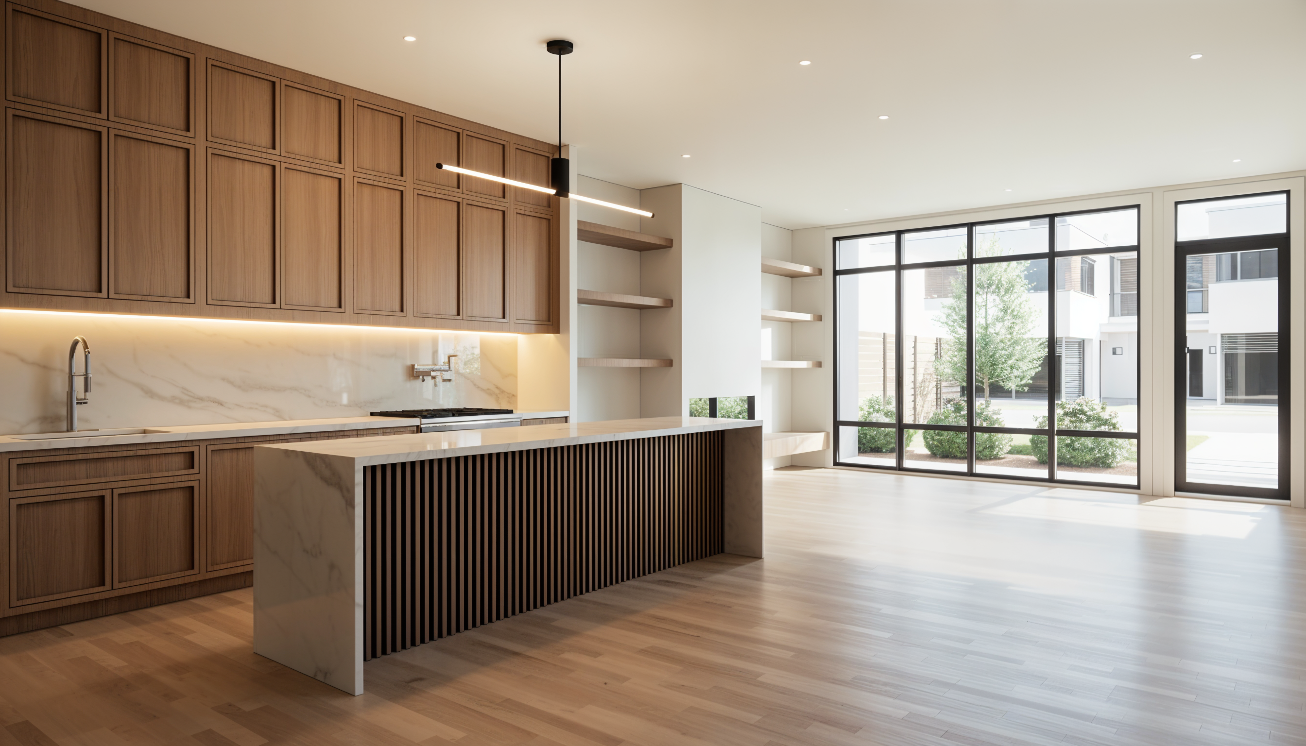 preserve the architecture layout lighting and camera angle of the original rendering exactly do not modify walls windows ceilings cabinetry flooring or built in elements replace placeholder furniture with pieces inspired by restoration hardware and minotti design language design style quiet luxury interior combining restoration hardware scale and warmth with minotti s sculptural modern silhouettes the space should feel calm architectural and curated furniture characteristics low profile furniture with substantial proportions sculptural forms soft rounded edges and thick upholstered volumes materials boucl upholstery performance linen suede honed marble travertine wire brushed oak warm walnut and brushed bronze or brass accents color palette warm neutral tones including ivory cream sand taupe soft greige and natural wood tones furniture arrangement balanced and architectural composition with generous spacing pieces should feel substantial and grounded lighting soft natural daylight combined with warm indirect lighting 3000k subtle shadows and natural light falloff rendering quality ultra photorealistic architectural photography style 35mm lens balanced exposure realistic textures subtle imperfections and natural reflections the final image should resemble a luxury interior photographed for architectural digest or a high end real estate marketing campaign do not chagne the architecture or structure of the image