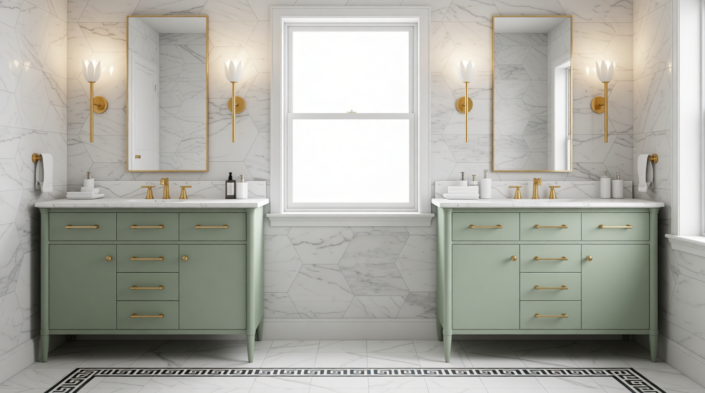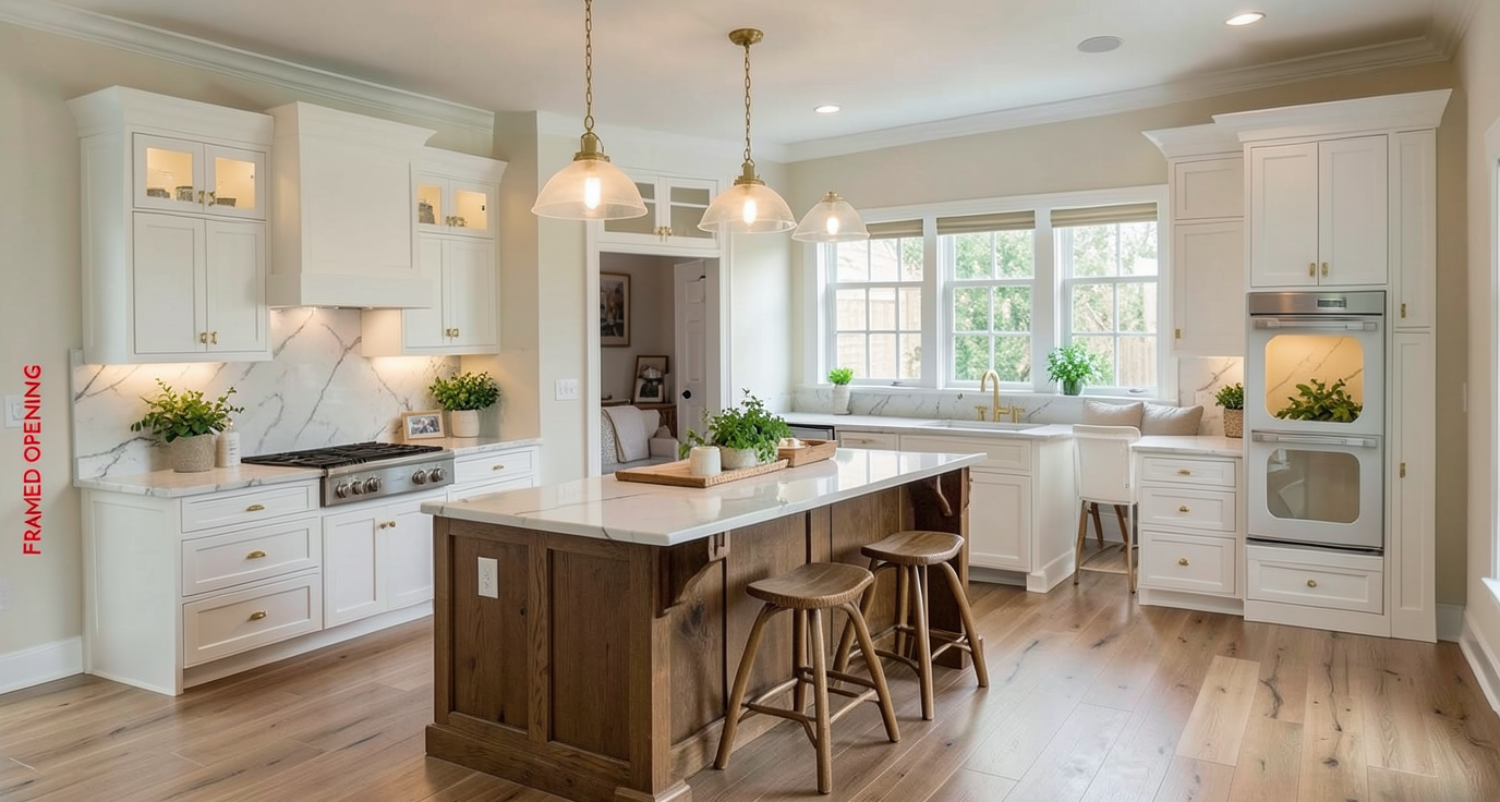 do not change the cabinets in any way preserve the exact cabinet colors materials finishes dimensions door and drawer styles hardware spacing alignment and all geometry exactly as shown do not alter the countertop shape backsplash appliances flooring lighting fixtures or wall structure only remove the construction materials clutter and mess from the scene clean the room and make it look finished and staged add a few simple tasteful home accessories appropriate for the style of the space but do not add or remove any furniture windows or architectural elements maintain the original lighting direction and realism enhance clarity and polish the photo while keeping the cabinetry and room design completely unchanged do not alter the lighting to keep the cabinet colors as they are in the image add new flooring stage the countertops for a kitchen do not change anything about the cabinets add a subzero stainless fridge in the opening on the right
