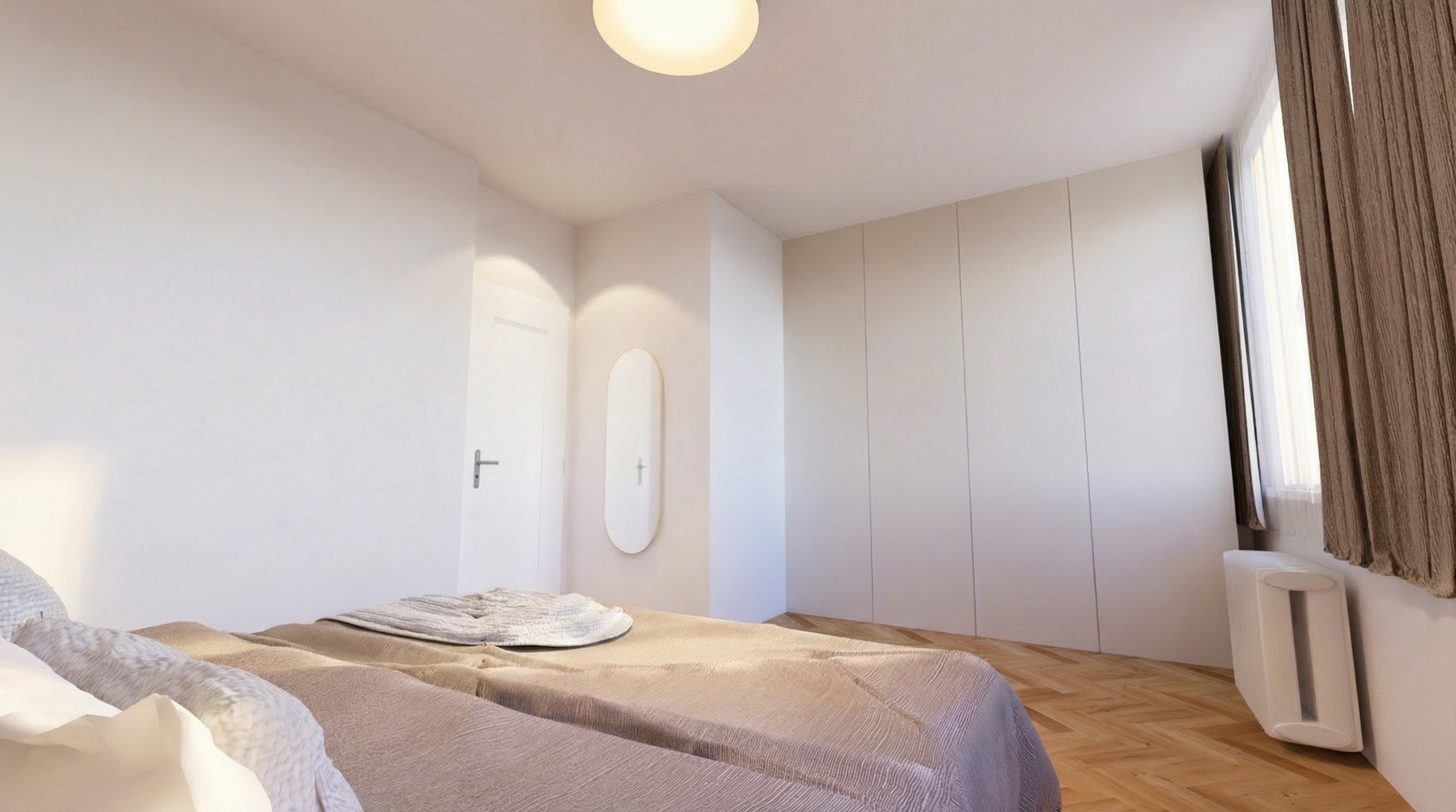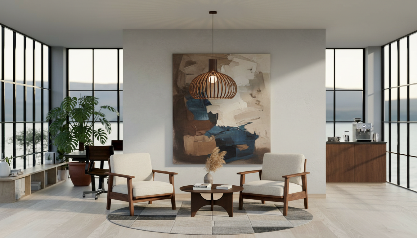a small and cozy social zone in a scandinavian style office interior a seating area with two statement chair in warm wood a low warm wood coffee table a round rug art on the wall big green plants big art painting on the wall with warm happy colors statement pendant with warm lightning light wood and soft textures