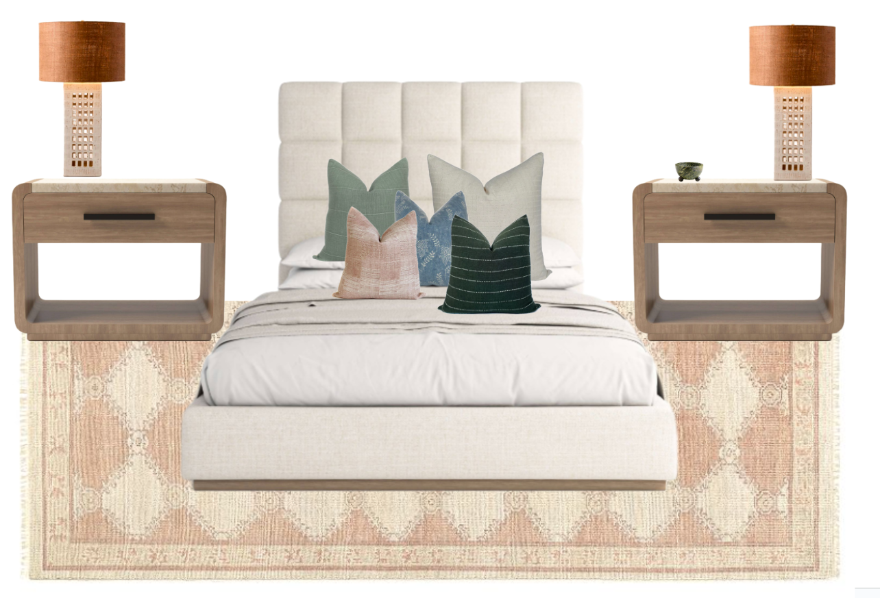 put bed up against a beige wall in a bedroom with big southern facing windows looking at mountains