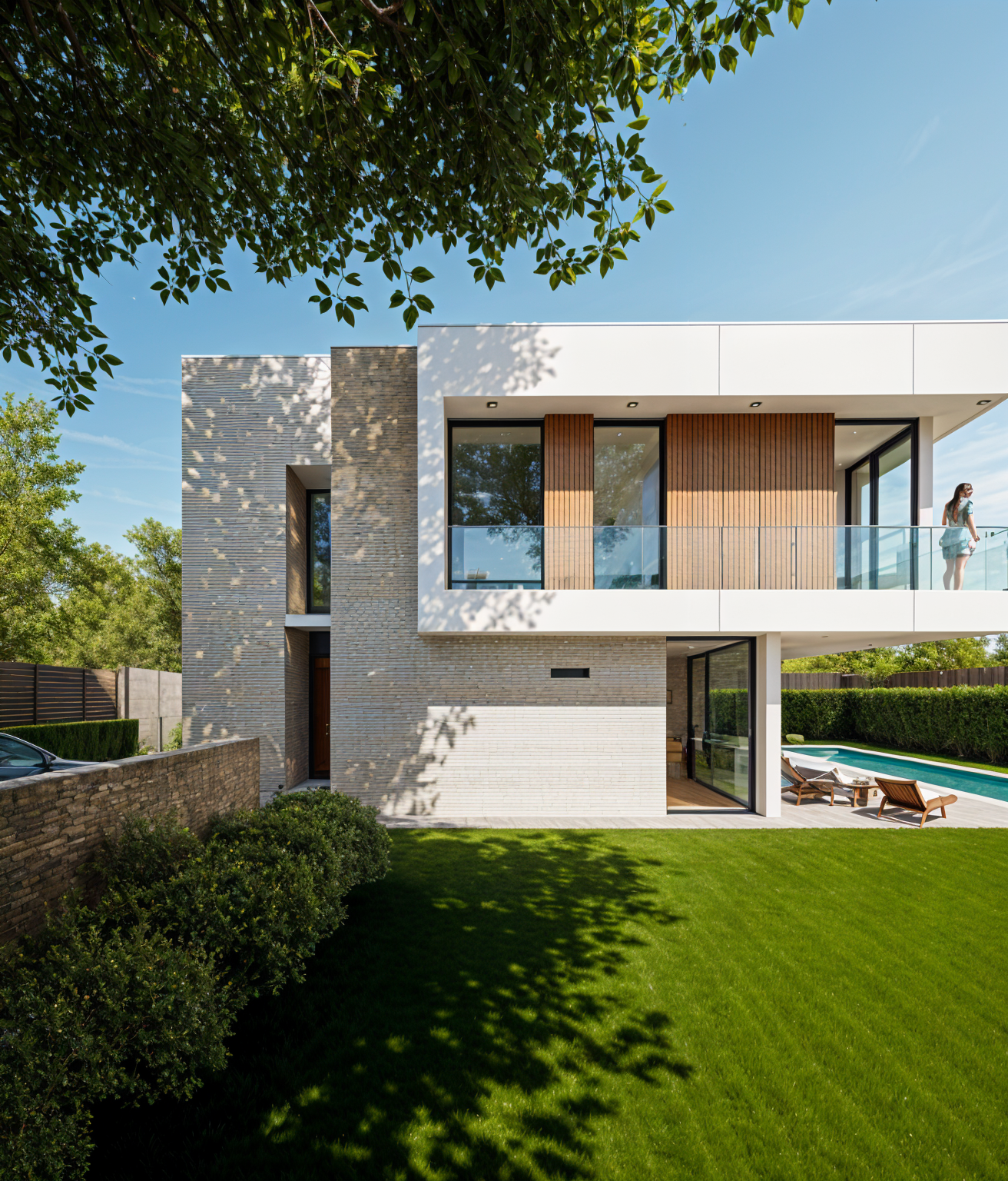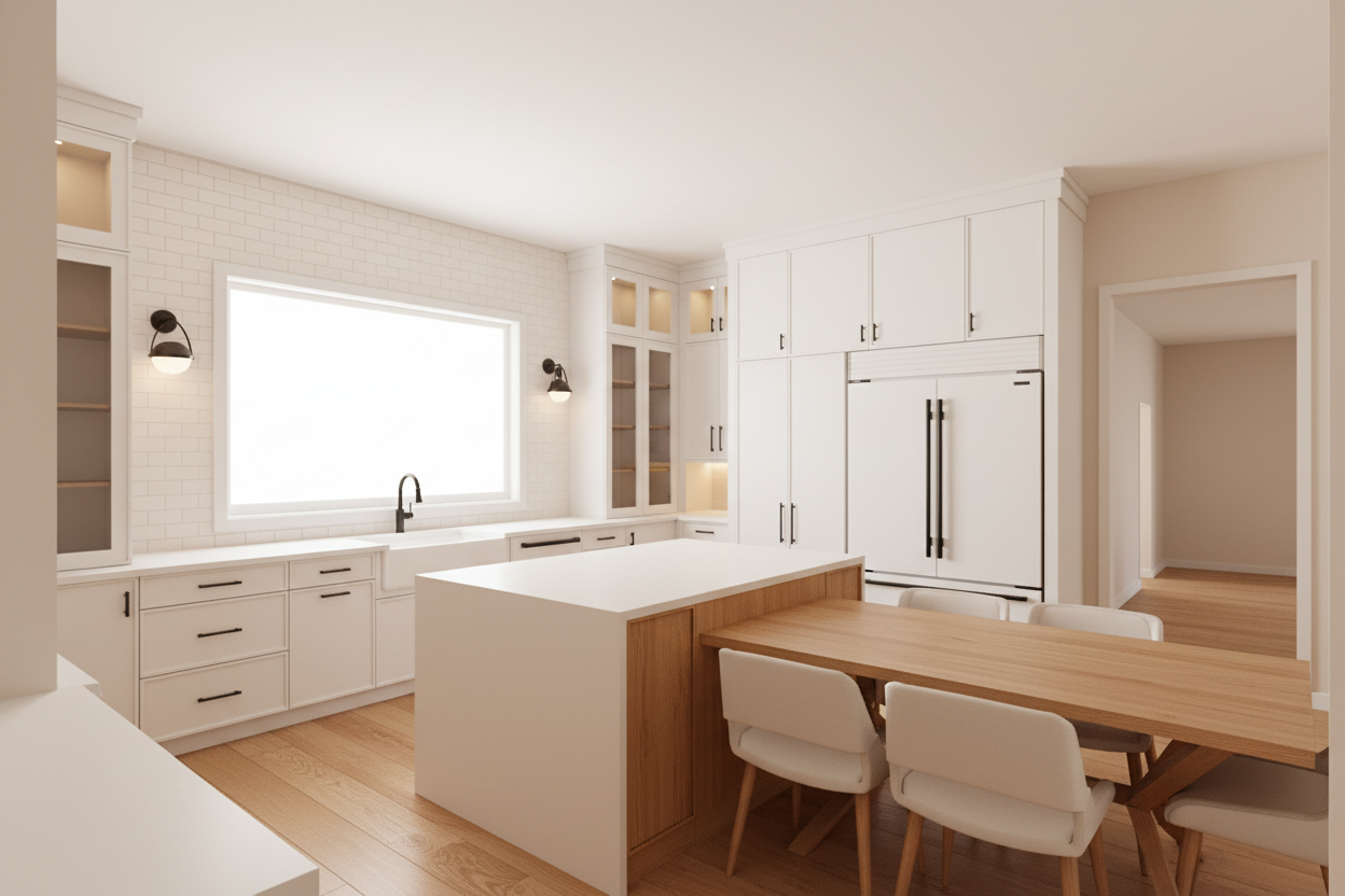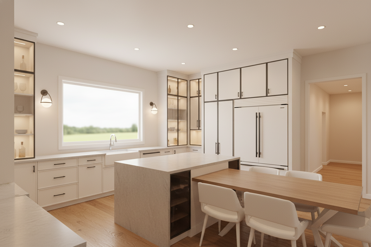 render a modern kitchen with smooth warm white walls a natural oak wood floor with visible grain creating warmth design tall elegant white doors with clear glass panels paired with black handles for a contemporary touch use soft ambient lighting to enhance a calm and inviting atmosphere the cabinets are a rift sawn white oak stained a light stain