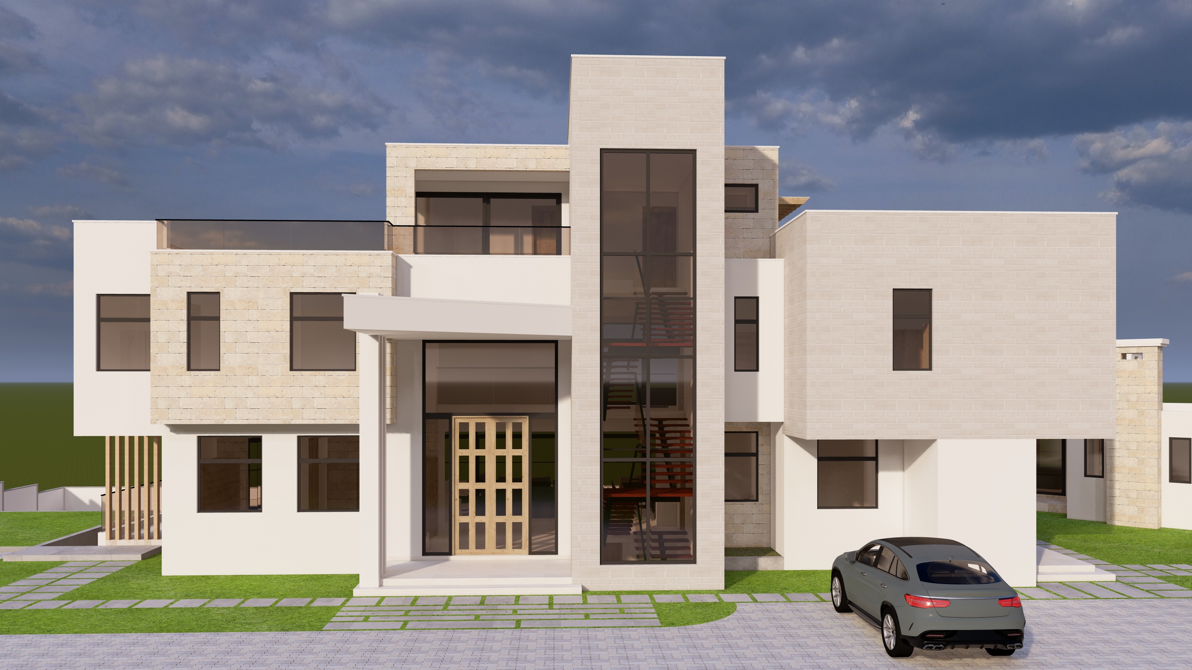 model of a villa add very few trees in background and in far background to give it context