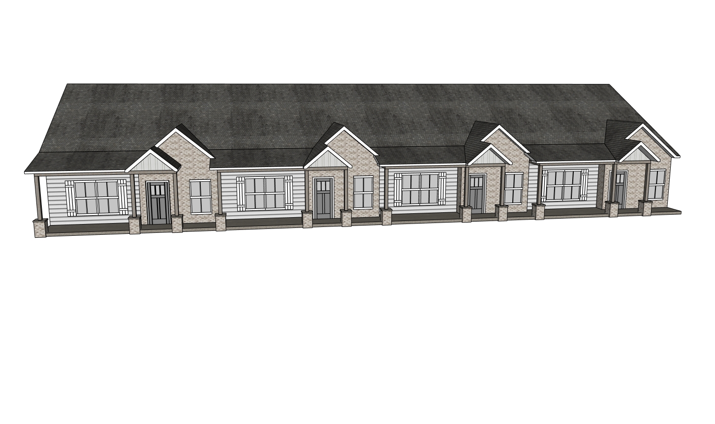 a modern row of townhouses with a cozy and inviting atmosphere the exterior walls are finished with a light beige brick texture the siding is a soft gray with white trim and the roof is a mid gray color each entrance features a classic white door with a small overhang surrounded by smartly placed white framed windows the front verandas subtle greenery the scene is set under a crisp blue sky with soft early morning sunlight casting gentle shadows enhancing the architectural details the townhouses are in a neighborhood show parking in front