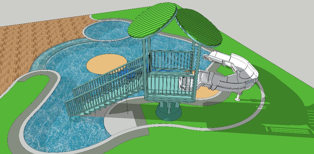 enhance the reference photo without altering any shapes layout or design produce a high resolution photorealistic and sunny render add realistic water effects and children naturally playing around the playground element keep all original geometry exactly the same integrate a realistic landscape background with lush greenery trees and natural outdoor lighting bright sunny atmosphere with accurate shadows and reflections ultra clear details real materials and lifelike environment