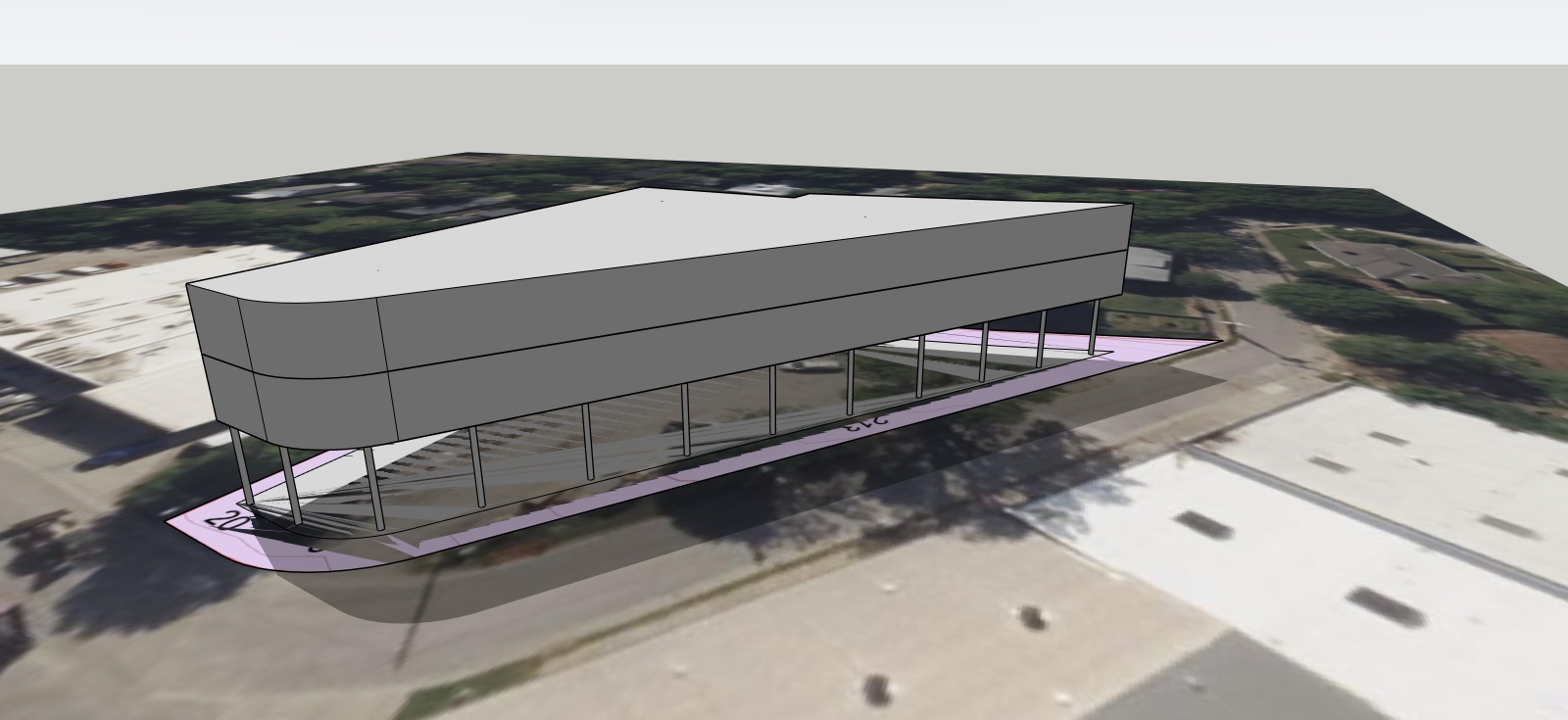 turn this rough massing model into a modern condo building with parking beneath keep the proportions massing and shape of the building consistent with the model add detail without altering the proportions total building is two stories of condos on top of a single level parking garage on the lower level cars should be visible in the deck the flat rooftop should include some occupiable deck area rooftop furniture and potted plants for reference this structure is 40 tall the setting is an urban corner near downtown raleigh with mostly 1 2 stories buildings nearby largely single family homes of a historic nature off to the right and the warehouse district off to the left use the underlaid photo for reference of the site context the building should be clad with a contemporary fiber cement panel with vertical windows that are mostly floor to ceiling image should be a dusk shot with lighting emanating from the windows style should be photoreal