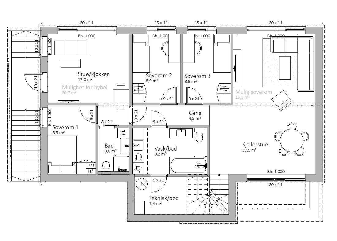 convert this floor plan into a realistic isometric 3d view of a full house show the space from an elevated angle with furniture walls and details visible floor plan beautifully rendered in a modern scandinavian style use a soft neutral color palette with white walls and light oak wooden floors add soft gray shades for the sofas and light blue for bedding in soverom 1 2 and 3 decorate kjellerstue with a cream sectional sofa and a round wooden dining table use soft pastel colors in decor items to create a cozy and welcoming atmosphere add large windows with natural sunlight creating a bright airy feel throughout use the same furniture as shows on the plan do not change the orientation of the floorplan