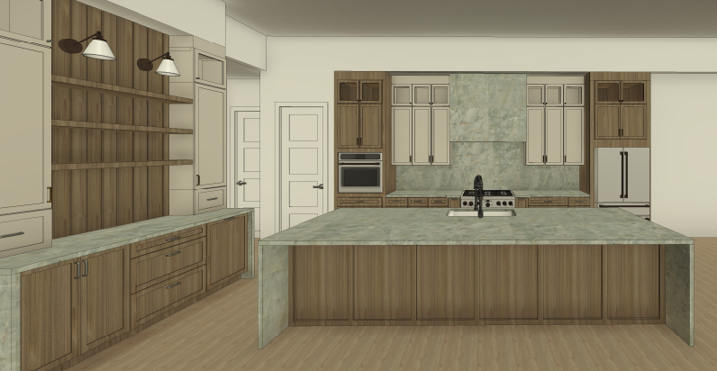 realistic photographic interior rendering in soft natural daylight preserve the architectural layout exactly as shown in the base image counter tops island and hood soft muted sage green marble with cloudy cream and warm grey veining hardware and sconces champagne brushed bronze warm aged refined not yellow brass not chrome coffee nook left corner recessed bay in the small recessed alcove on the left wall style a minimal coffee nook on the existing counter surface place one compact modern espresso machine in matte black or brushed stainless a small stack of two ceramic espresso cups with saucers in cream a minimal matte ceramic canister and one small trailing plant in a simple ceramic pot clean and editorial not cluttered island styling one medium leafy green plant in a minimal stone or ceramic pot one ceramic fruit bowl with mixed seasonal fruit and one linen covered hardcover cookbook lying flat nothing else on the island open shelving left wall add one small trailing green plant in a matte ceramic pot one linen covered cookbook lying flat and one minimal matte ceramic vessel clean and intentional do not change any materials colors or architectural elements do not add pendant lighting only add the styling described above