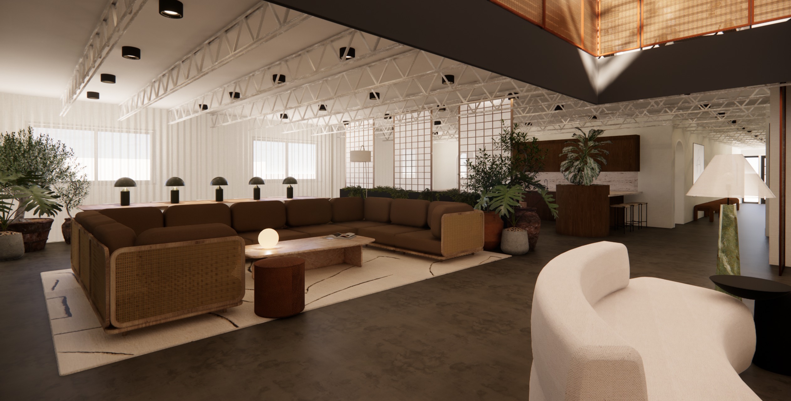 make this image more realistic add a velvet effect to the fabric of the sectional add a cream boucle fabric to the curved white sofa in the front of the image turn on all interior lighting and make them produce a warm glow add undercabinet and undercounter lighting in the kitchen place accent pillows on the sectional and color them navy grey cream and sage green don t change anything else about the image
