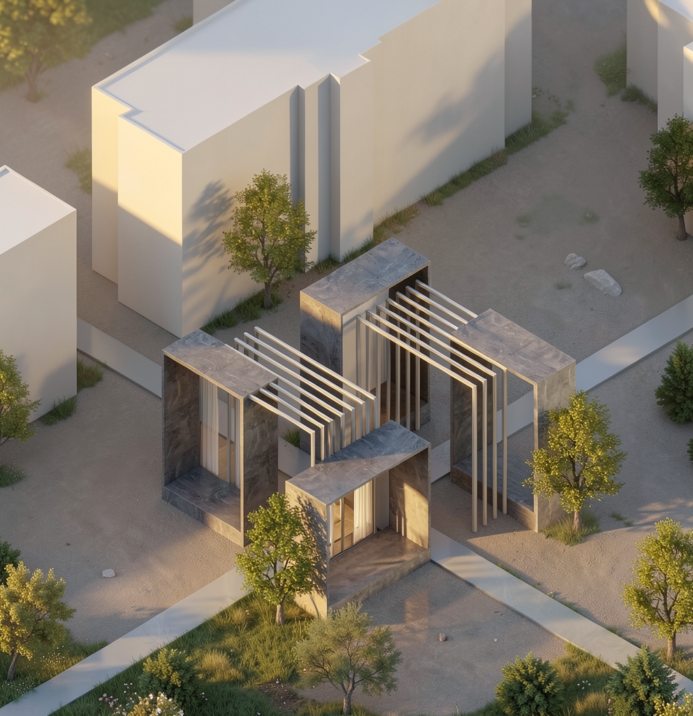 a sophisticated architectural visualization of the designed minimal surface museum from front right angle emphasizing front view placed within a dense old city new york urban context the structure appears as a porous continuous sculptural mass with smooth organic curvature contrasting with the rigid rectilinear surrounding buildings of glass steel and concrete creating a dialogue between softness and rigidity fluidity and orthogonality reflection on road after rain wet road motion blur of taxi light the fa ade has depth and thickness producing dynamic shadow patterns include pedestrians interacting with the structure to clearly express human scale red makrked is human scale surroundings include sidewalks street trees traffic blur and mid rise buildings typical of manhattan lighting is soft cinematic daylight late afternoon with long shadows enhancing the geometry materials are matte white or light concrete plaster like finish to emphasize form and curvature camera slightly low angle 3 4 perspective wide lens 24 35mm architectural photography style mood calm contemporary experimental high end architectural rendering