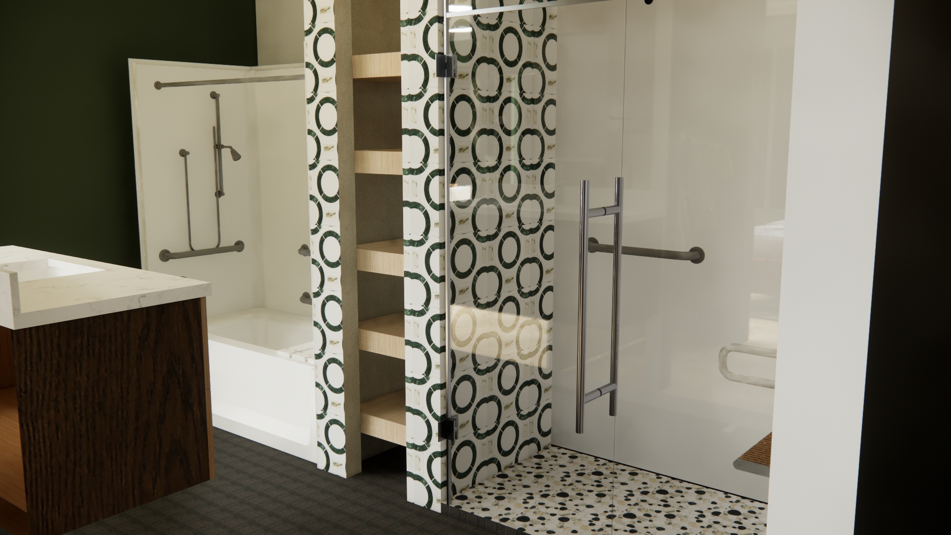 render a modern and elegant bathroom with a dark green accent wall and white marble countertop incorporate a shower area with circular patterned tiles in green and white include a glass shower door with metallic handle add natural wood shelves for storage the floor should have a mosaic of black white and grey tiles create a serene and sophisticated atmosphere with soft warm lighting