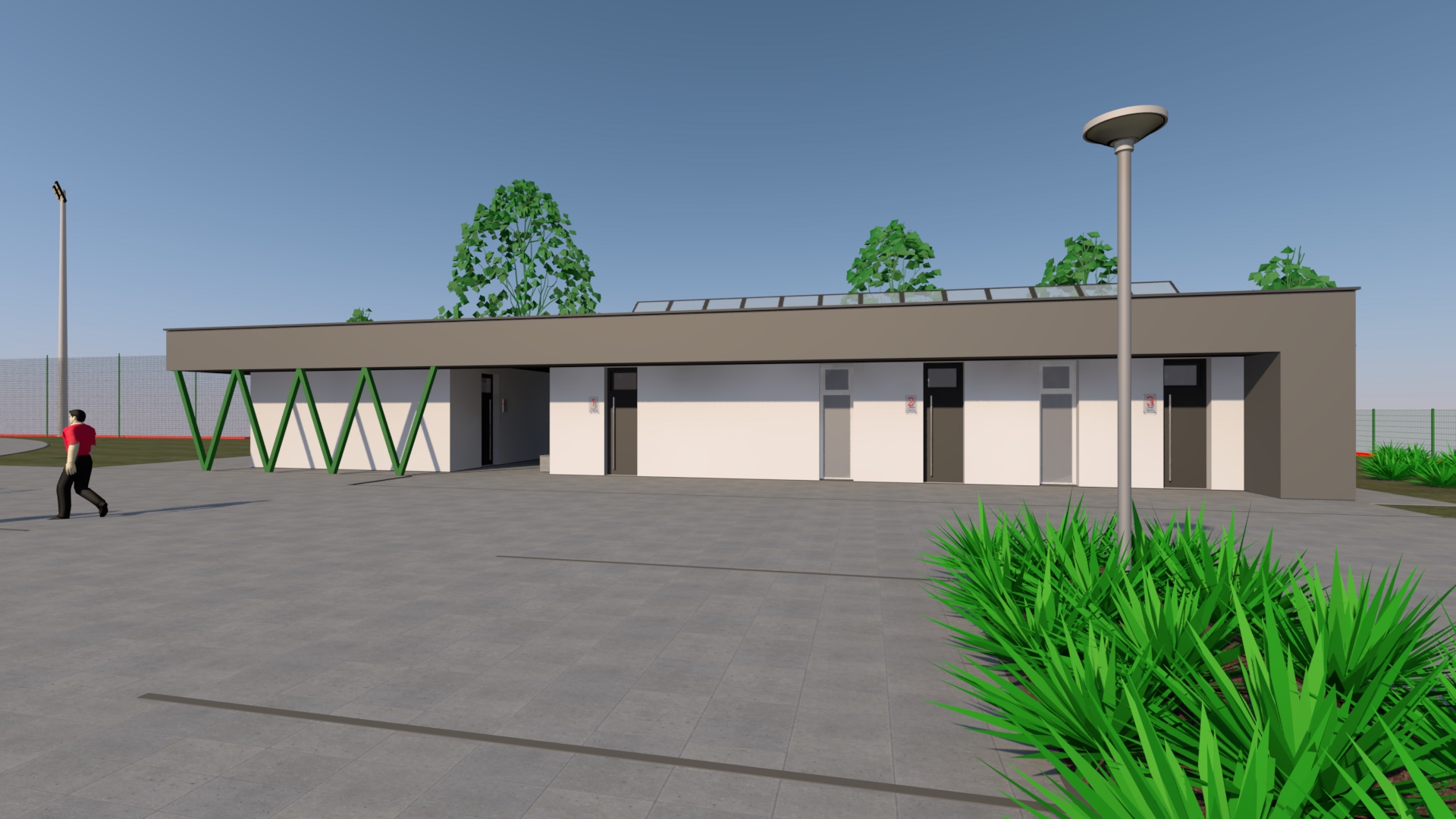 exterior shot white facade graphite roof attic graphite doors gray paving slabs sunny and blue sky sports field and greenery in the background people walking nice cars deep shadows architecture