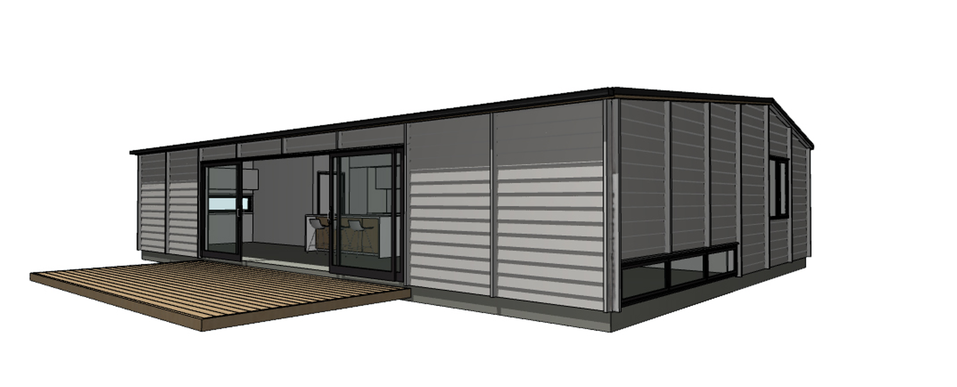 black roof white weatherboard cladding black window frames interior lights on low timber deck concrete paving trees in background extensive native planting sunset