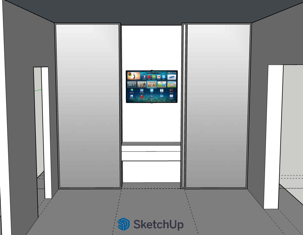 mirror glass on the front surface of the cabinet with the grey profie around it white door on the left and antracite balcony door on the right side put also in the mirror put some reflection on the other side where is bad and two modern small night cabinet floor is wooden in the middle of the cabinet is tv and under it is small wooden table under table is small chair the depth of the middle part of the cabinet is 35cm from the front surface put some shadow and also modern lighting on the ceiling the mirror glass is little darker