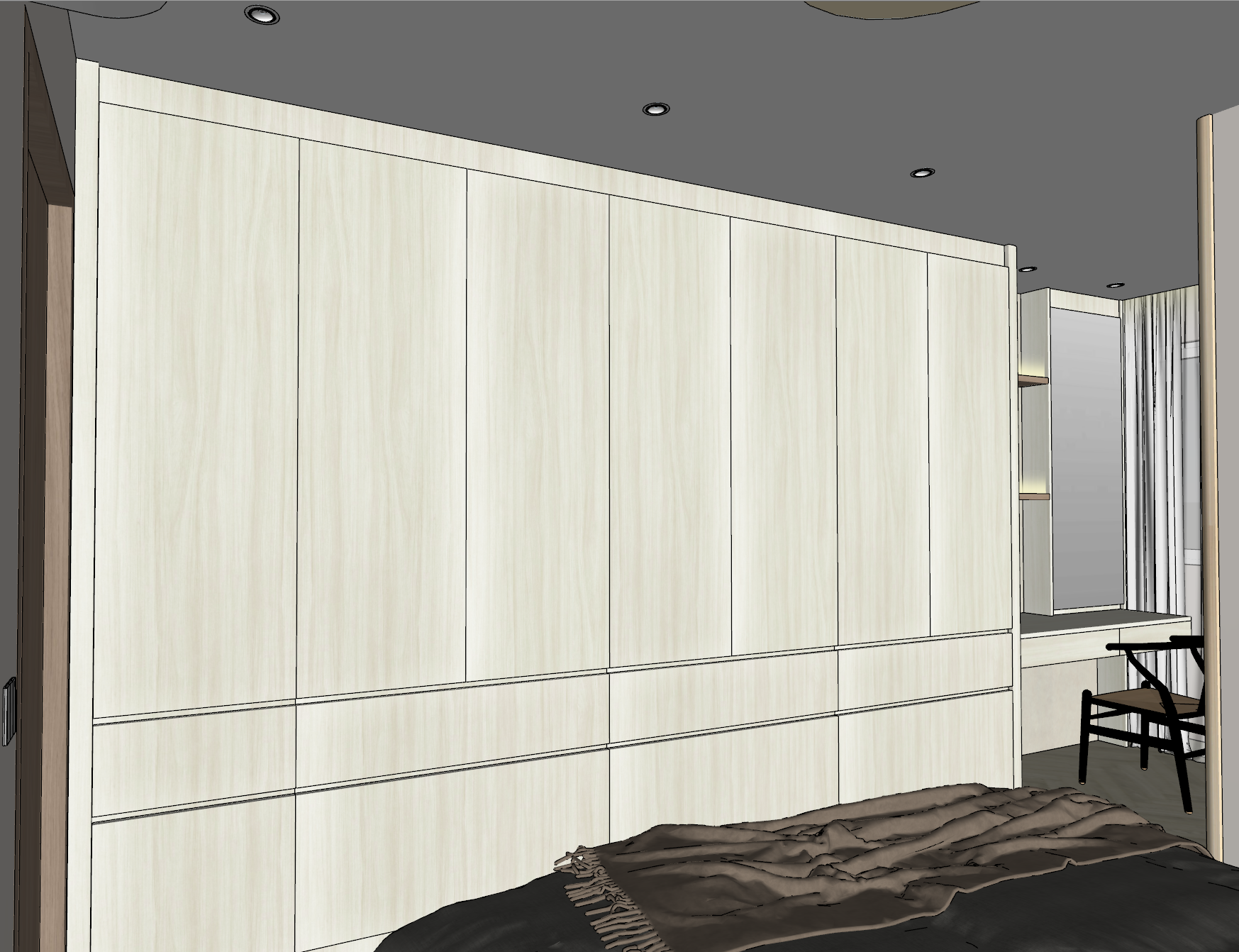 wardrobe is in light birch wood finish the ceiling comes with recessed downlights and make the overall vibes brighter