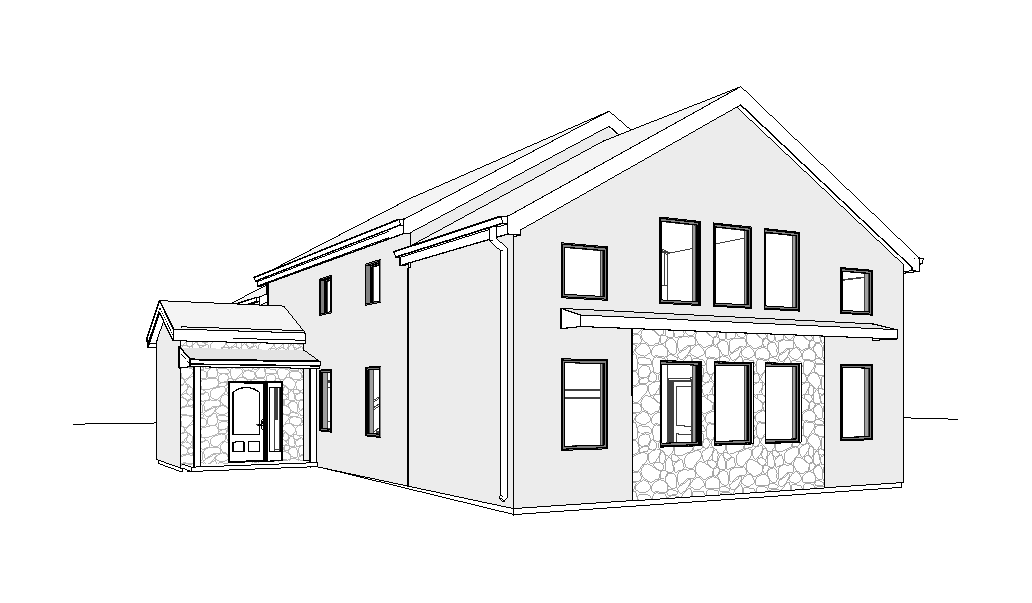black board and batten siding with black trim black shingle on main roof metal roof on other roofs off white stone where stone is shown make look real