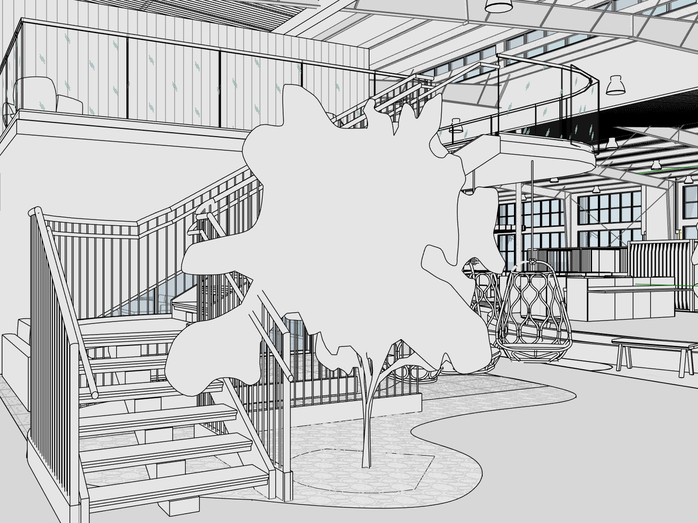 make this image look realistic make the railing black with a wood top cap make the railing around the balcony all glass with a wood top cap make the area around the trees be filled with small landscaping rocks make the tress be small elm trees
