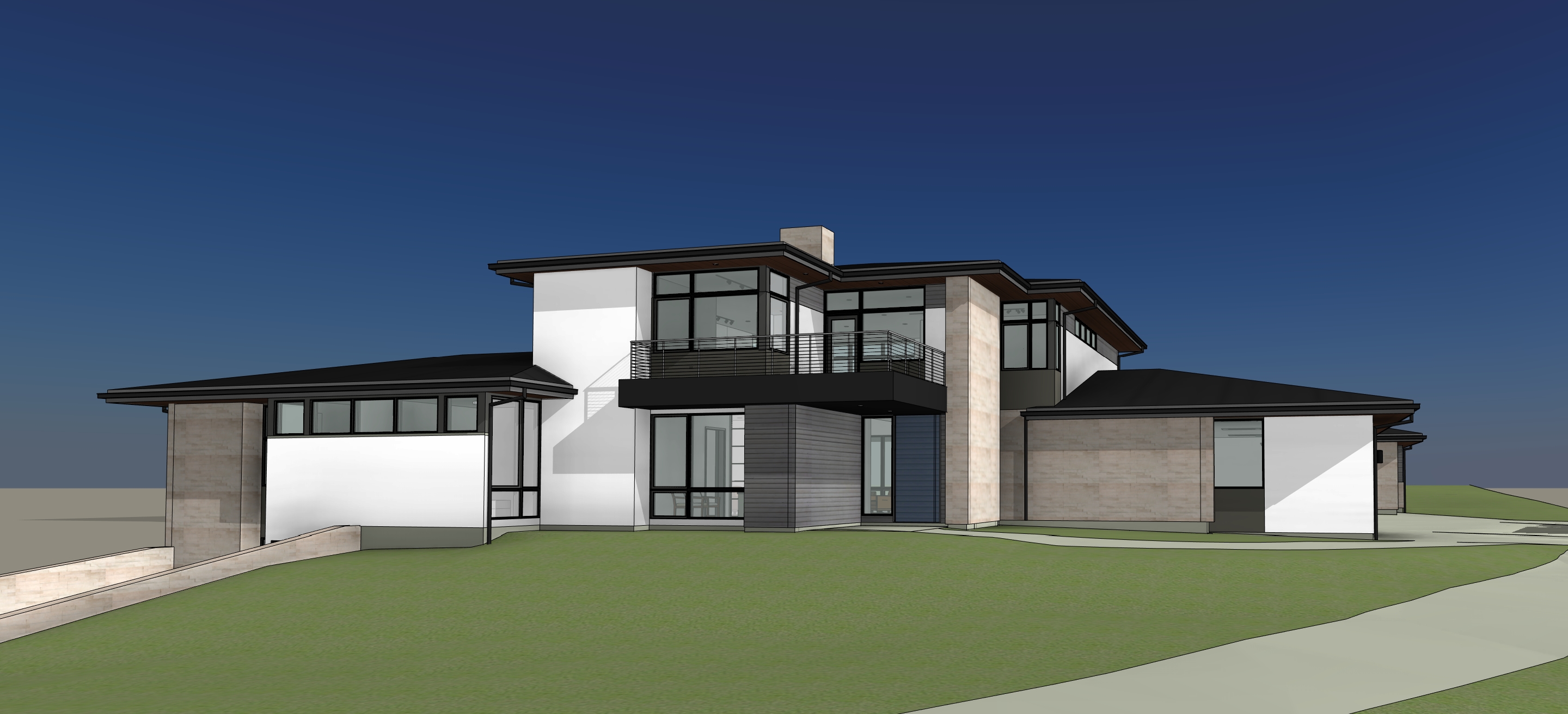 strict maintain exact building geometry massing proportions window door locations and camera perspective from the input image do not alter the design rooflines overhangs or railing layout project contemporary luxury residence create a photorealistic architectural magazine quality rendering with clean modern detailing materials apply precisely as modeled primary walls smooth white stucco matte finish subtle natural variation no gloss accent vertical elements warm brown natural stone large format with tight joints realistic texture depth secondary cladding gray stained cedar siding horizontal orientation fine grain visible roof black standing seam metal roof crisp seams subtle reflectivity not glossy windows frames black aluminum thin profiles high contrast railings black metal horizontal rail system clean and minimal front entry door bold modern oversized pivot door in deep muted blue smooth finish lighting atmosphere time of day late afternoon golden hour soft warm sunlight grazing across the fa ade to highlight material textures realistic shadows with depth under overhangs and balcony sky clear with subtle gradient no dramatic clouds site context keep minimal and clean clean modern landscaping restrained lightly manicured lawn with subtle variation no fake bright green add a few low profile ornamental grasses near foundation concrete or light stone walkway drive with realistic texture do not add excessive trees or obscure architecture rendering style ultra realistic materials and lighting lumion v ray quality sharp but natural no over sharpening accurate reflections in glass subtle interior hints no glare maintain clean architectural composition not overly staged camera composition keep original camera angle exactly slight depth of field very subtle balanced exposure no blown highlights on stucco