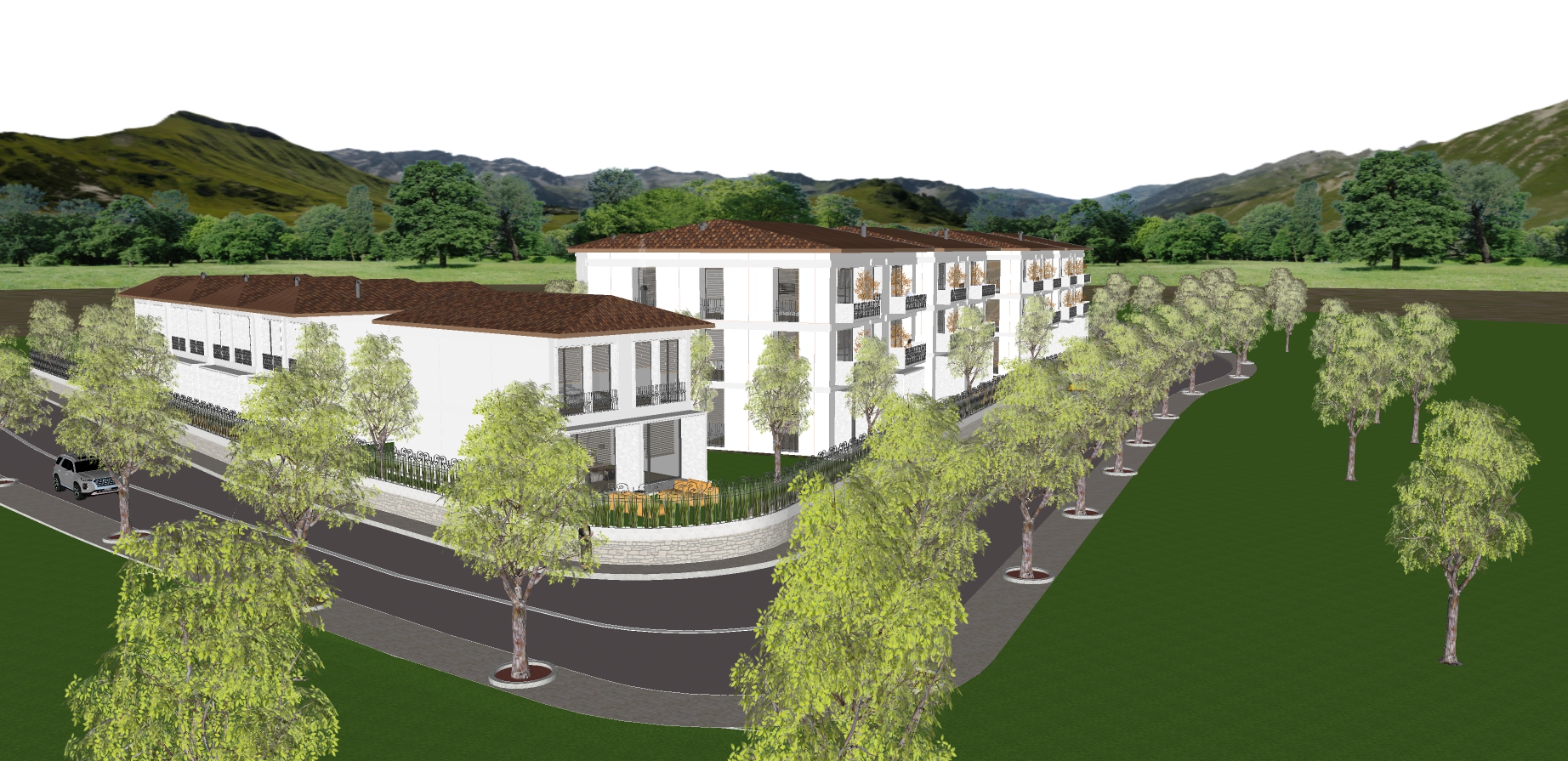 create a picturesque landscape featuring a modern to neoclassical residential complex the buildings showcase white walls with elegant black accents and warm dark brown terracotta roofs surround the area with lush green grass and vibrant trees using varying shades of green to add depth the road is a smooth dark gray asphalt lined with trees whose trunks are a natural brown and foliage a mix of light and dark greens the horizon reveals rolling hills painted in earthy brown and green under a bright and clear sky set the atmosphere to be bright and serene evoking a sharp suburban morning add green alongside the fence perimeter some kids playing in the garden sky blue with some white clouds add some furniture inside the villas and apartments