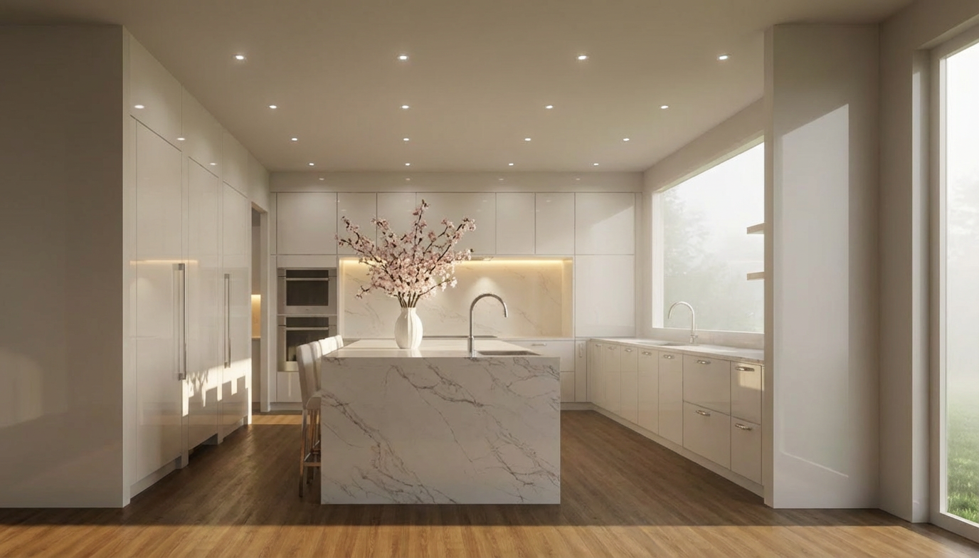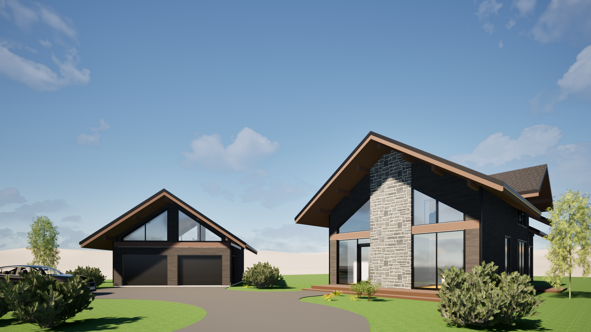 generate a photorealistic 3d rendering from this image by strictly preserving without any modification the colors materials and the orientation of the coverings visible in the reference image do not interpret or replace the materials faithfully respect the wood the two tone shingle on the roof and the stone as illustrated shade texture orientation exactly maintain the volumes and proportions of the building integrate the building into a credible natural environment with vegetation typical of quebec use uniform and diffuse natural lighting daylight evenly illuminating the house and the garage with soft shadows and a slightly cloudy sky